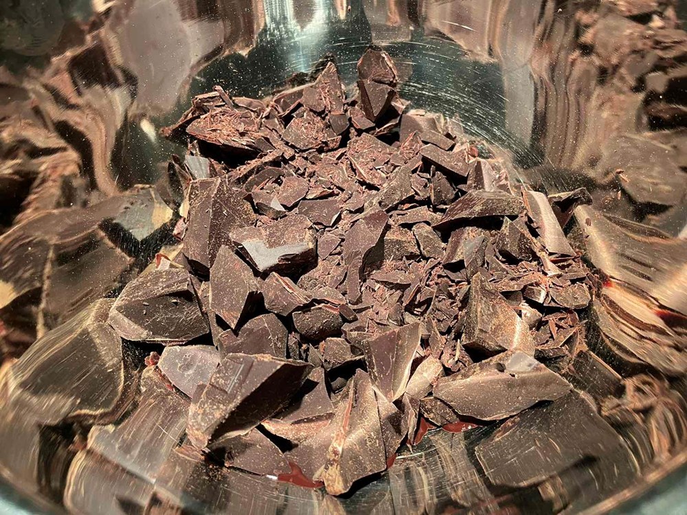 Čokoladu za kuhanje (ja sam u svojem perverznom slučaju koristio 98% kakaovac, ali dobra je svaka čokolada koju imate u kući , čak i ona koja nije za kuhanje i koja vam je ostala kad vam ju je NETKO poklonio, ili ona koju vaša dica nisu još stigla pojesti), raskomadane na srednje sitne komade oštrim nožem.