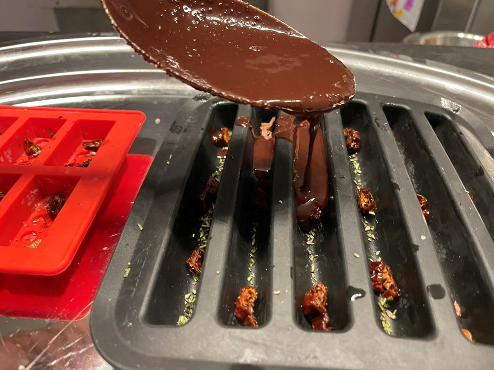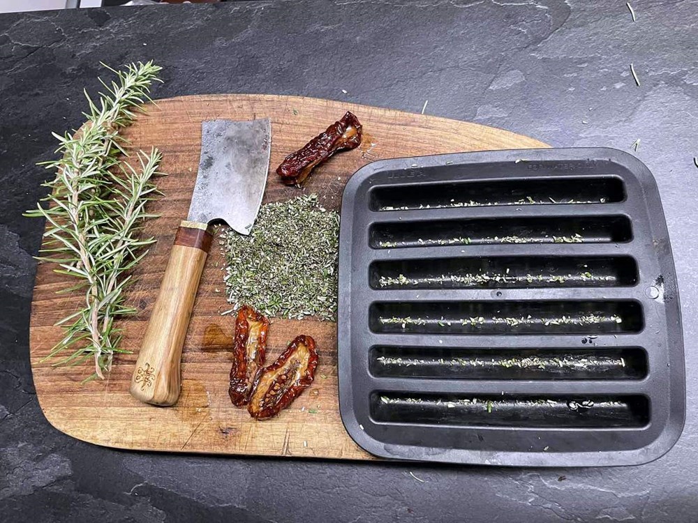Ako nemate kalup za praline, možete iskoristiti plastičnu ambalažu iz koje ste prije neki dan pojeli sve čokolatine ili bombonjere ili silikonski kalup za led (jednu od te dvije stvari sigurno imate) prvo na dno kalupa pospite malo praha od ružmarina kojeg ste nasjeckali, pa onda u svaki kalup stavite dva do tri tanko nasjeckana komadića sušenog pomidora.