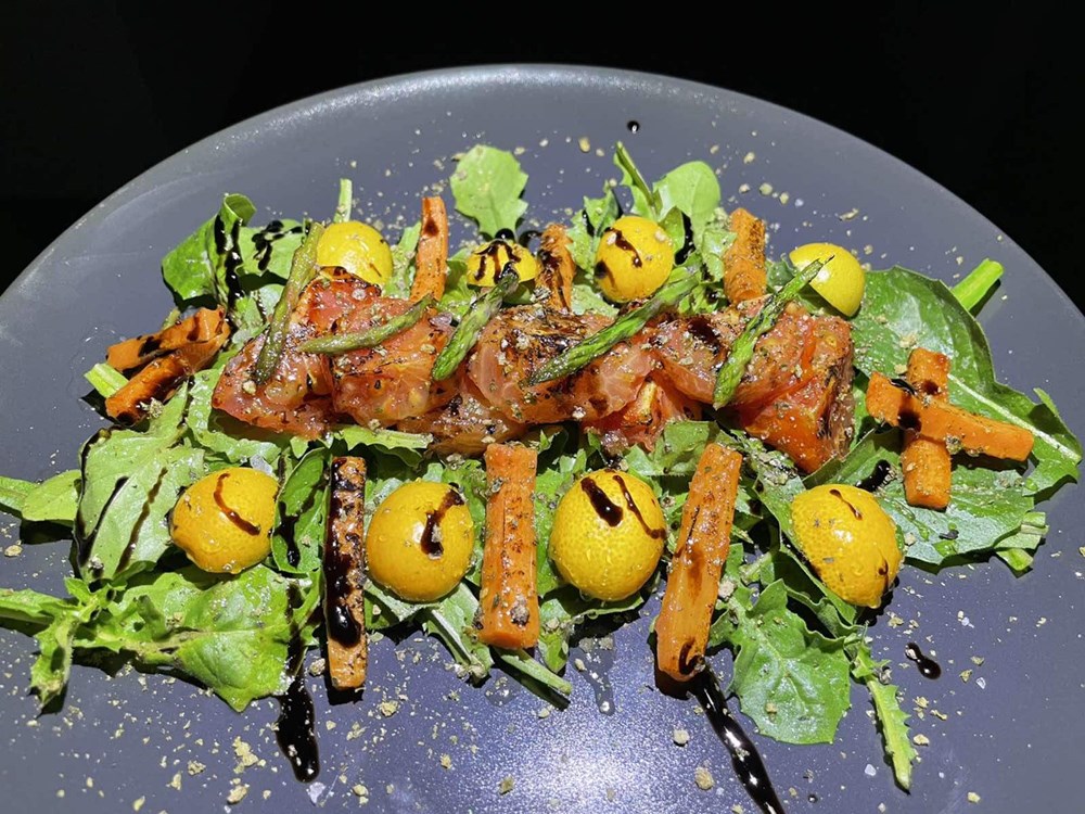 Kada smo sve to napravili na vrh pomidora poslažemo šparuge. Kombinacija prženog pomidora, mrkvice, maslačka, kumkwata , meda, soli i zelenog papra, stvorit će utisak u nepcu kao da jedemo prženu piletinu s povrćem, čak će nas jelo tako i zasititi. Ova je salata lagana, puna vitamina i minerala i idealna je za ovo prijelazno razdoblje dok nas i dalje raznorazne prehlade vrebaju u zoni između toplog i hladnog…