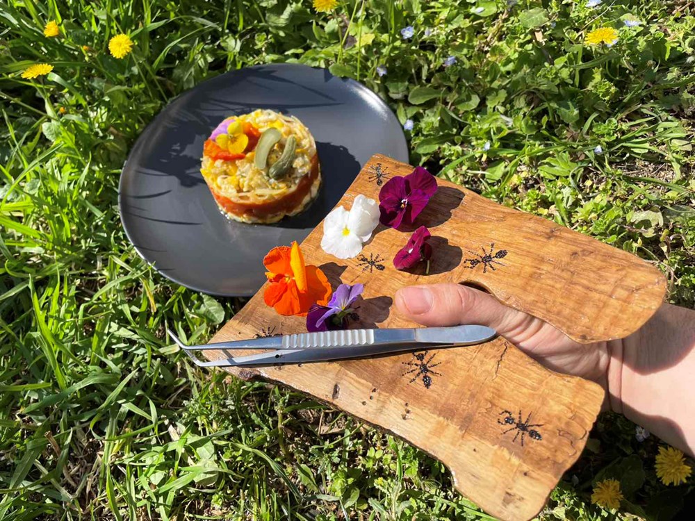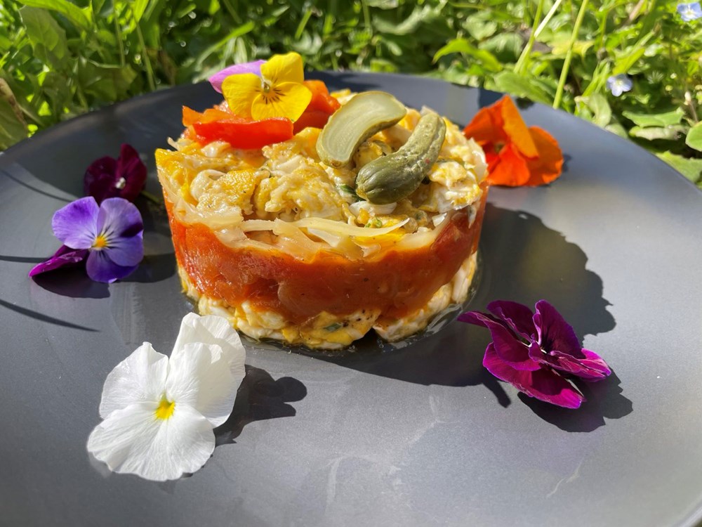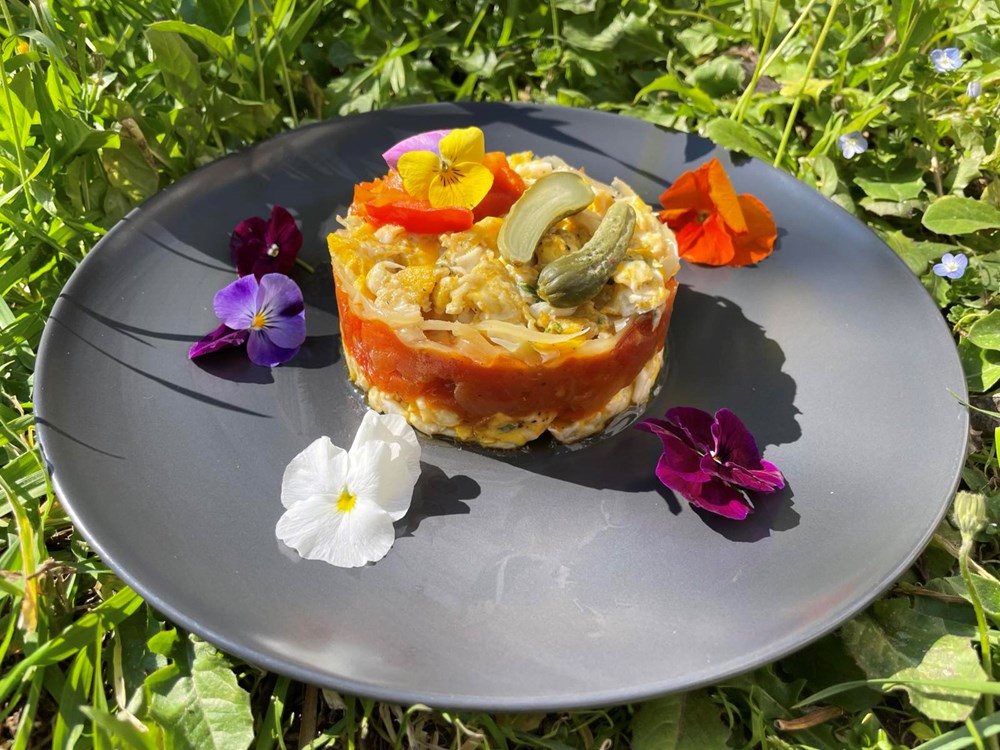 Na gornji sloj fritaje stavite par cvijetova dragoljuba ili maćuhica, laganim potezom rukom dignite kalup, i dobili ste fine dinning oblik svoje fritaje… uživajte u jelu!