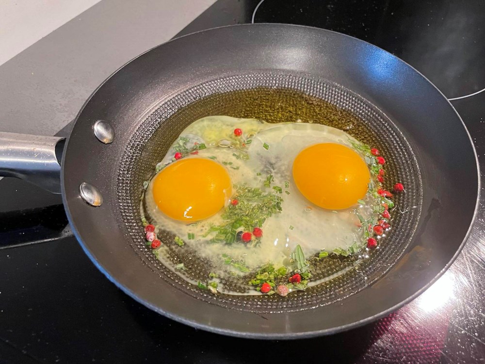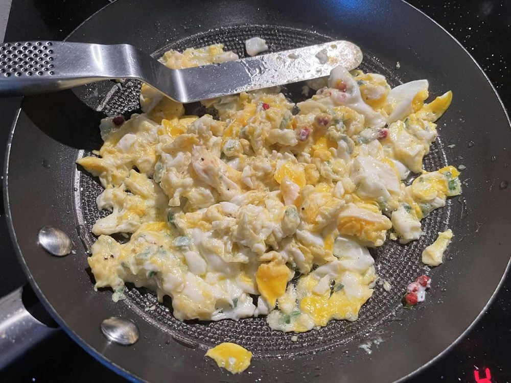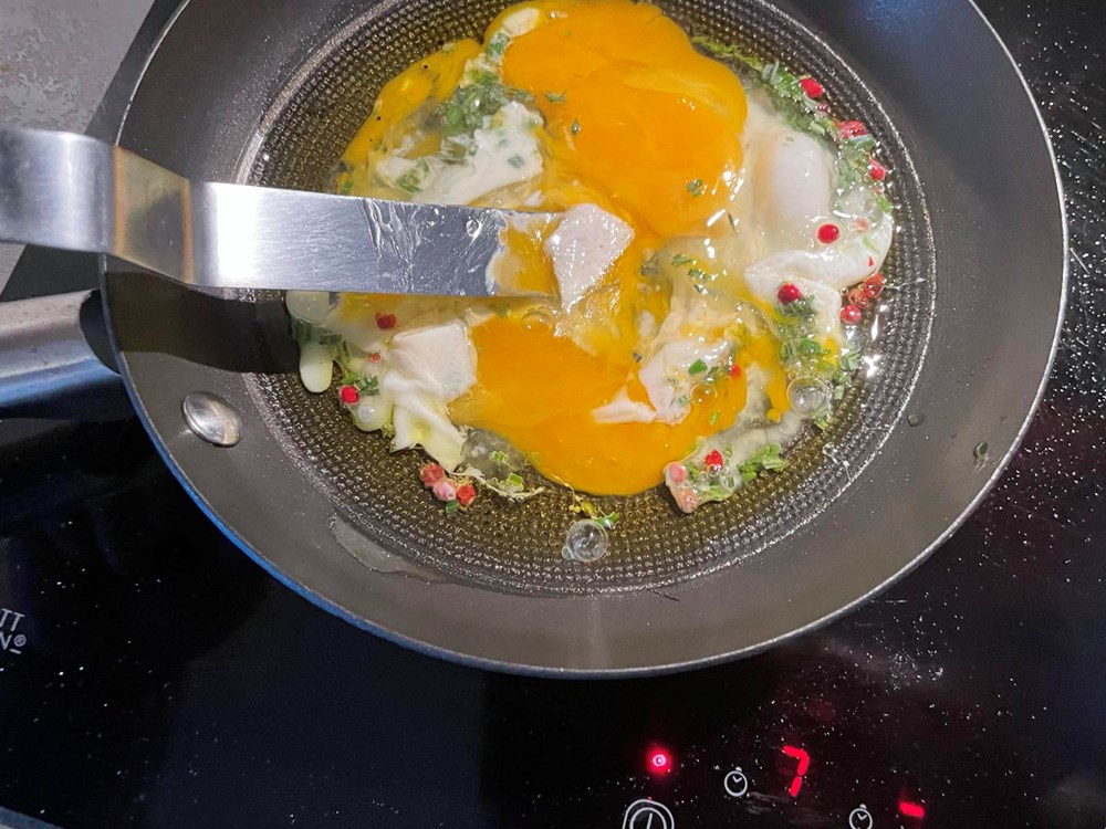 Kada se maslinovo ulje zagrije dodajte dva jaja, sitno nasjeckane listiće kadulje s jedne grančice i pola čajne žličice crvenog papra u zrnu. Pecite tako uz konstantno miješanje 4 do 5 minuta, kada fritaja postane kompaktna maknite ju s izvora topline.