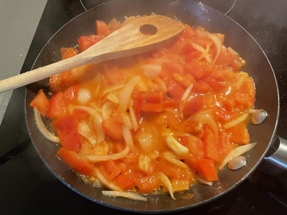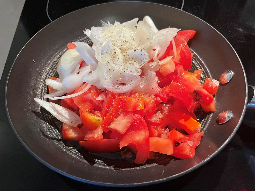Prvo u maloj tavi na vrelom maslinovom ulju pržite pomidor narezan na kockice i nasjeckani luk, nakon 5 minuta prženja dodajte pola jušne žlice livadnog meda i prstohvat soli pa pržite tako na laganoj vatri još tri minute uz konstantno miješanje. Dobivenu šalšu maknite iz tave u manju zdjelu, a tavu isperite vodom i obrišite kuhinjskim ubrusom, pa ju stavite ponovo na srednje jaku vatru i dodajte maslinovo ulje.