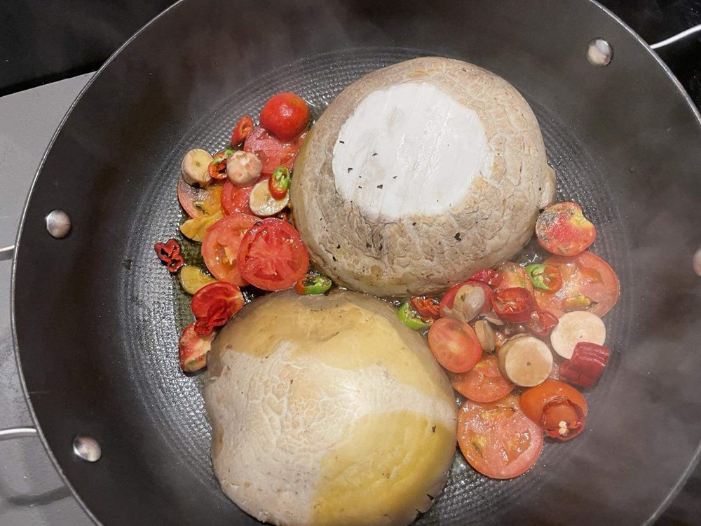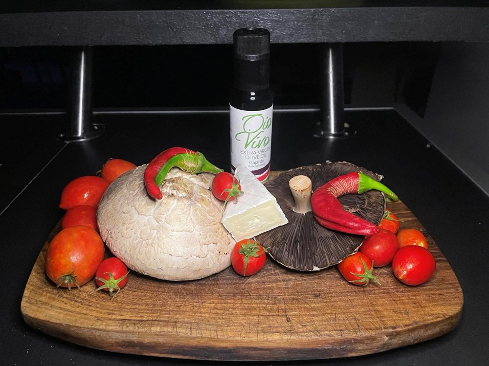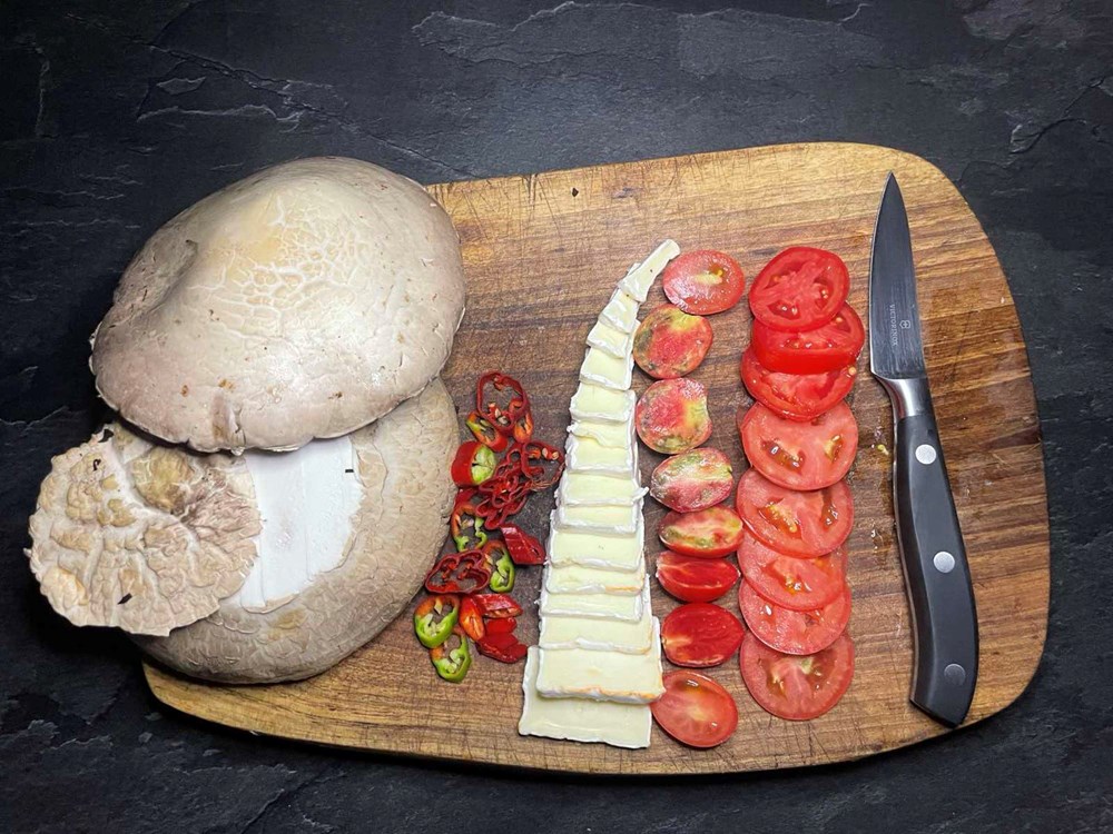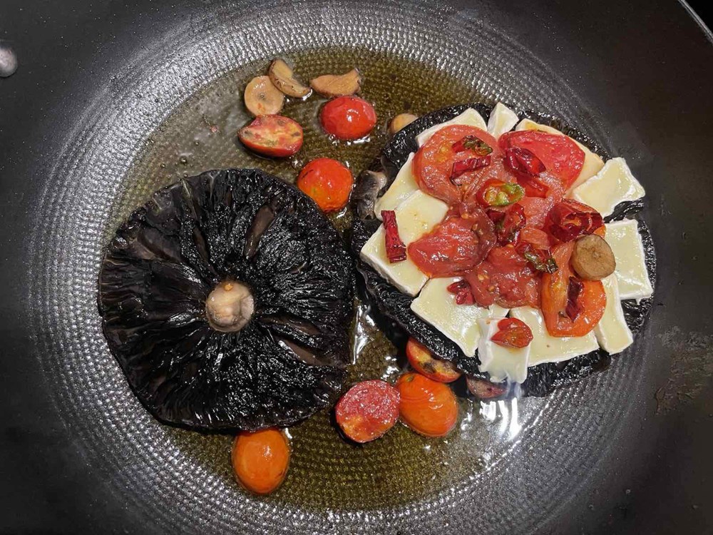 Nakon 3 minute otklonimo poklopac, ugasimo izvor topline, pa po rastopljenom brieu poslažemo komade cherry pomidora i feferona te ih zatim poklopimo drugim klobukom od gljive.