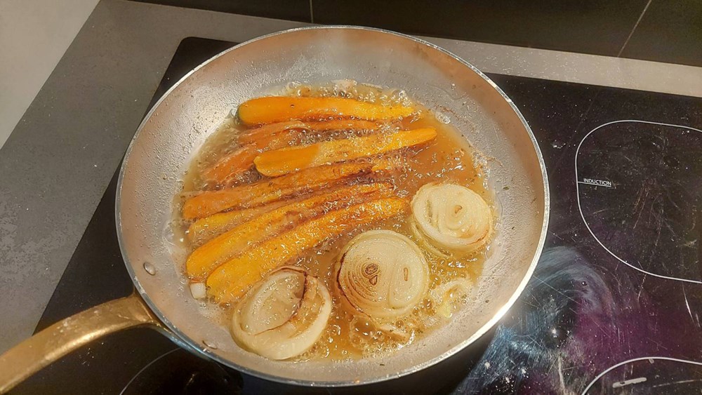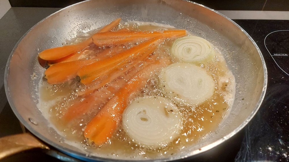Što se dogodilo ? Jedan se manji dio smjese od brašna i ružmarina, prilikom prženja oslobodio i asimilirao u vrelom maslinovom uju. Takvo je ulje sada spremno da u njega stavimo trakice mrkve i kolutiće od luka. Mrkvu i luk pržimo cca 1,5 do 2 minute sa svake strane, sve dok im struktura na površini djelomično ne posmeđi. Luk i mrkvu zatim izvadimo u ravan tanjur na papirnati kuhinjski ubrus da upije višak ulja, dovoljno je da odstoji tako 30-ak sekundi.