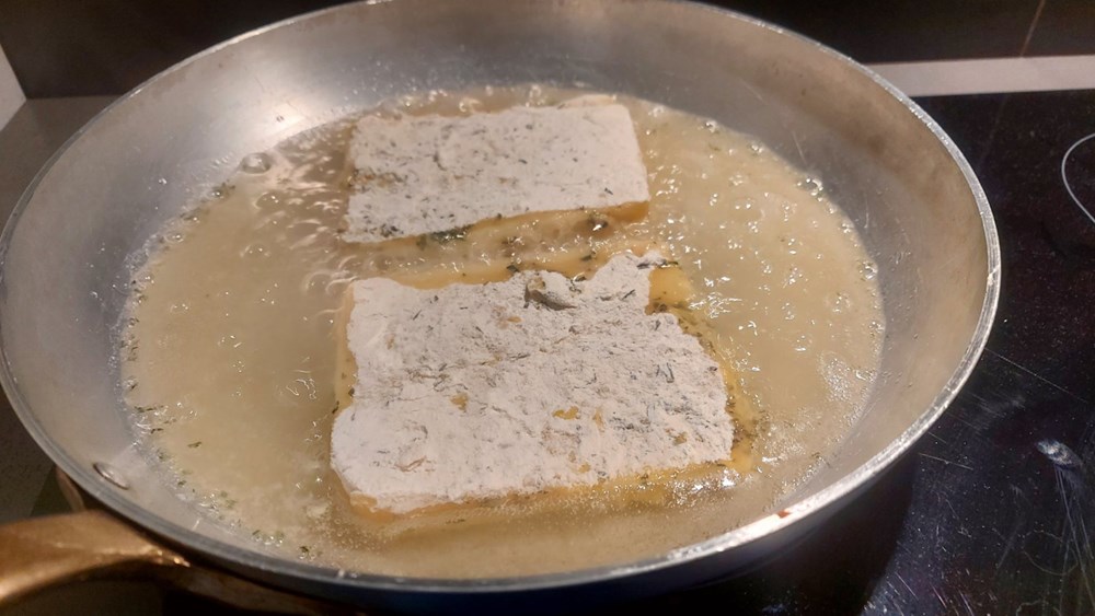Nakon toga sir izvadimo iz zdjele, lagano ga otresemo, pa stavimo u tavu s vrelim maslinovim uljem.