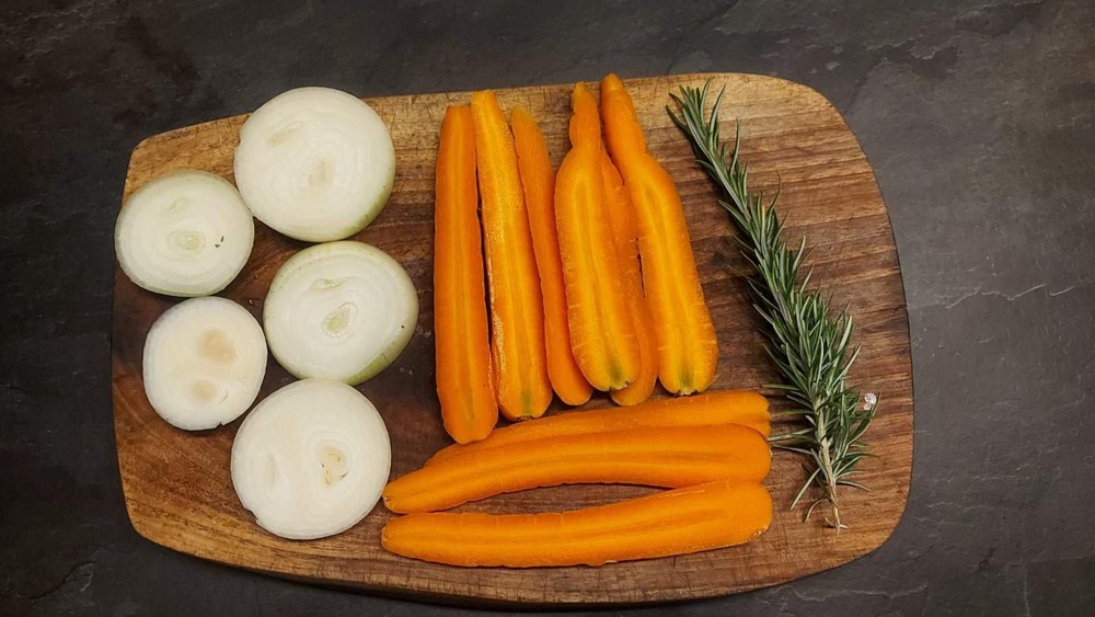 Mrkvu izrežemo po dužini, na tri deblje trake. Luk izrežemo na kolutove, nešto tanje od vašeg malog prsta.