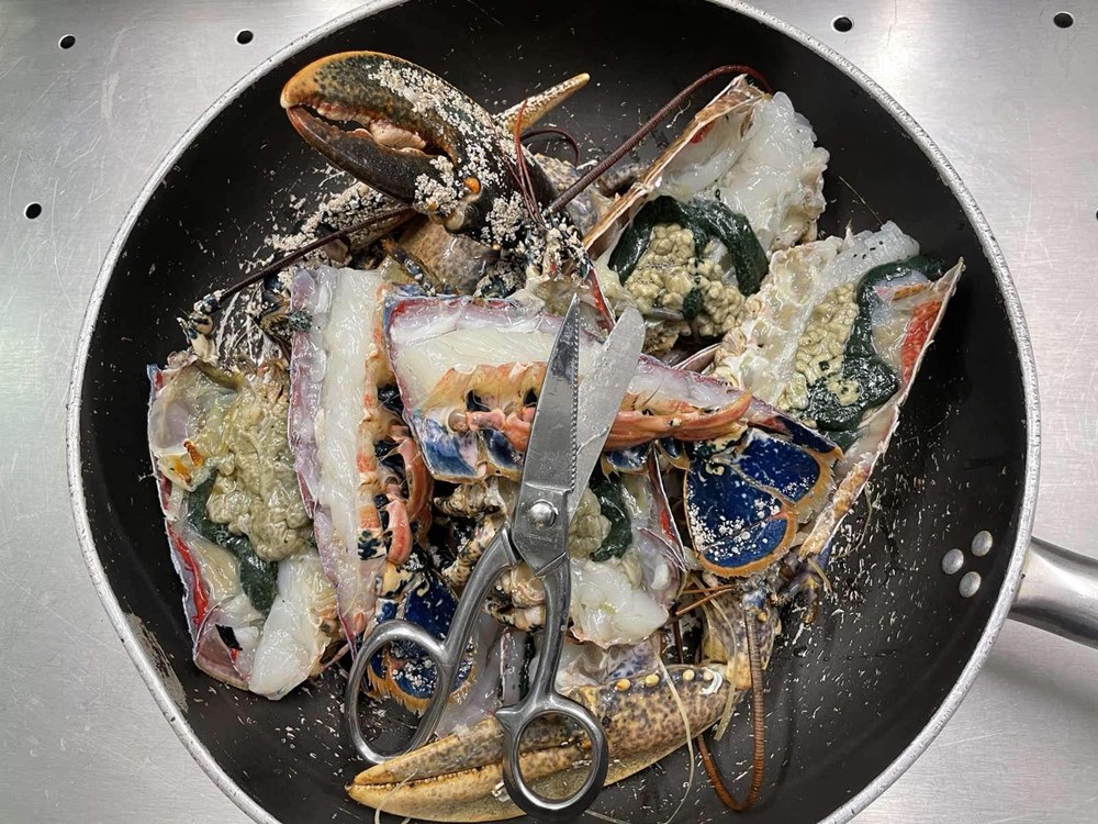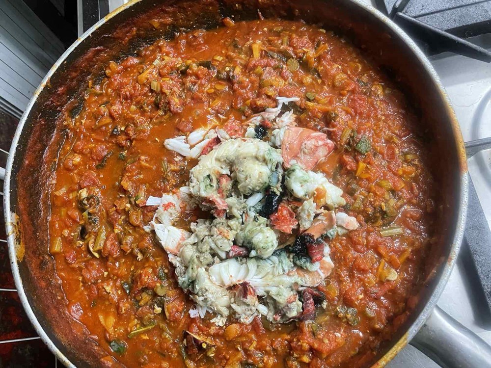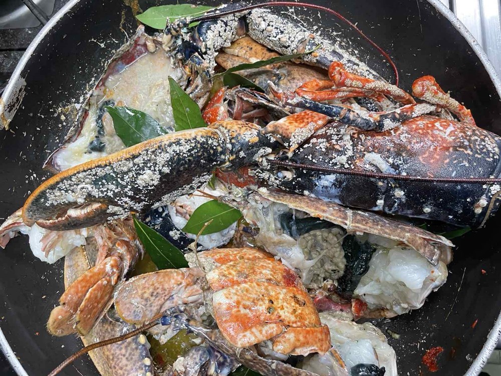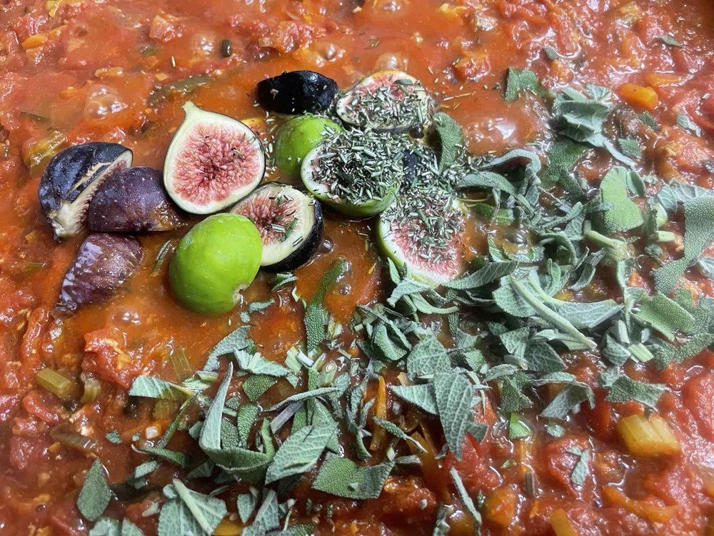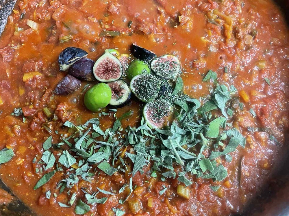 Nakon 15-ak minuta podignemo poklopac od tave u kojoj se dinstaju naši hlapovi, komade hlapova većom žlicom izvadimo na veći pleh te iz oklopa izvadimo njihovo meso manjom vilicom, pincetom i kliještima. U tavu i vodu u kojoj su se dinstali hlapovi ubacimo pomidor, celer, polpu od pomidora, jušnu žlicu meda, čajnu žličicu cvijeta morske soli, lavandu na trakice, sitno nasjeckane iglice ružmarina od jedne grančice, 7 dkg osmijeha na licu i pet smokvi razrezanih na pola pa ih dinstamo još nekih 20-ak minuta, te nakon toga ubacimo meso od hlapa i dinstamo na laganoj vatri još nekih 20 minuta.