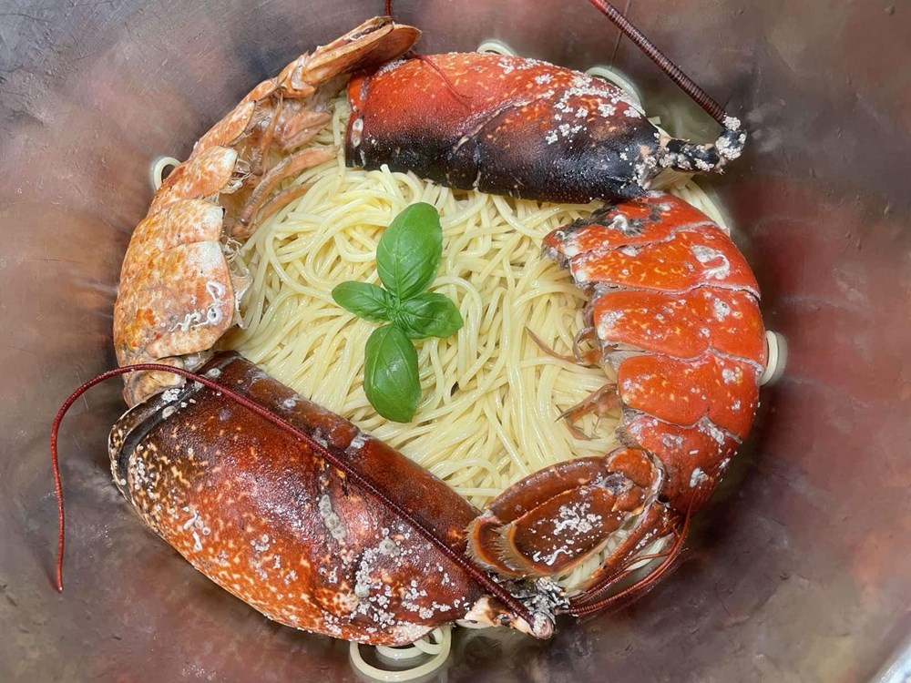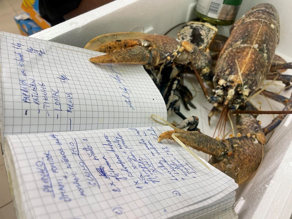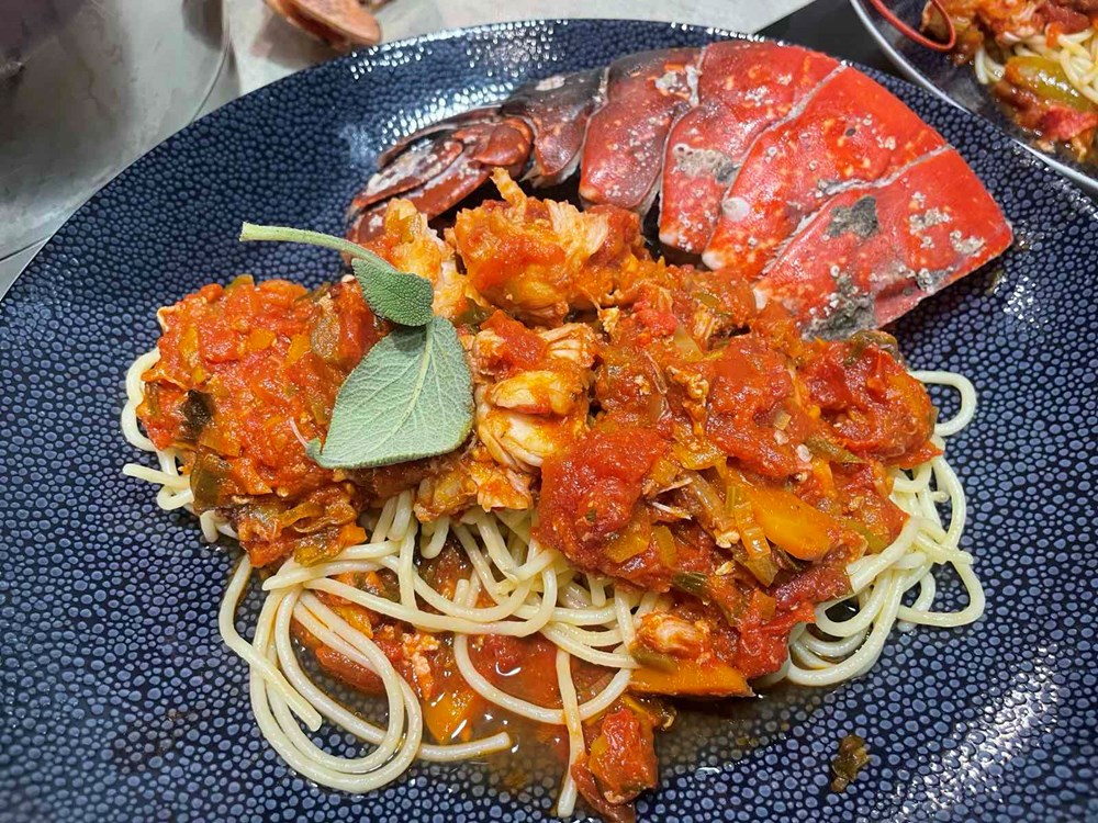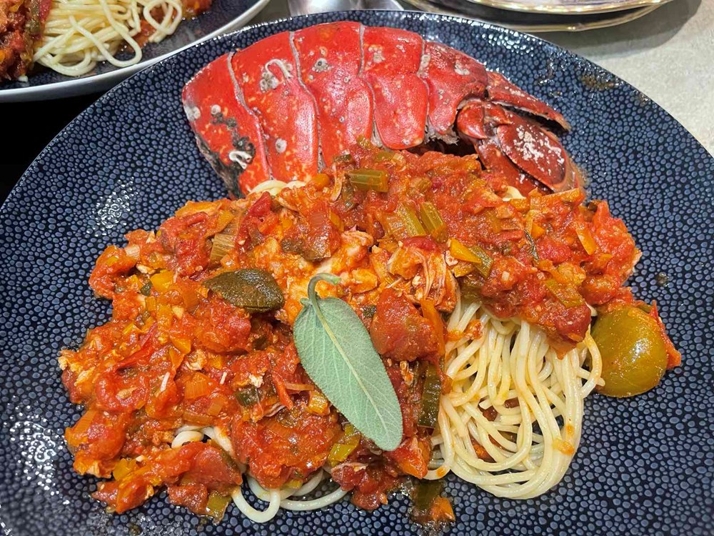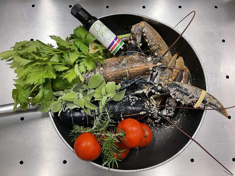 Nakon 15-ak minuta podignemo poklopac od tave u kojoj se dinstaju naši hlapovi, komade hlapova većom žlicom izvadimo na veći pleh te iz oklopa izvadimo njihovo meso manjom vilicom, pincetom i kliještima. U tavu i vodu u kojoj su se dinstali hlapovi ubacimo pomidor, celer, polpu od pomidora, jušnu žlicu meda, čajnu žličicu cvijeta morske soli, lavandu na trakice, sitno nasjeckane iglice ružmarina od jedne grančice, 7 dkg osmijeha na licu i pet smokvi razrezanih na pola pa ih dinstamo još nekih 20-ak minuta, te nakon toga ubacimo meso od hlapa i dinstamo na laganoj vatri još nekih 20 minuta.