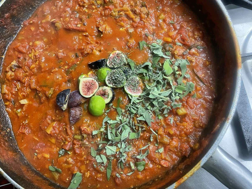 U međuvremenu, zadnjih 7 minuta u kipućoj slanoj vodi skuhamo spaghette al dente, nakon 7 minuta ocijedimo ih od vode u kojoj su se kuhali i pomiješamo sa šugom od hlapa, povrća, smokvi i začina i VOILA! Dobar vam tek veselo društvo!