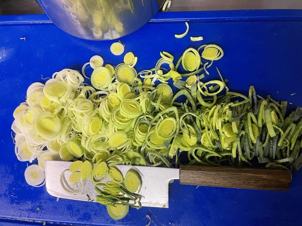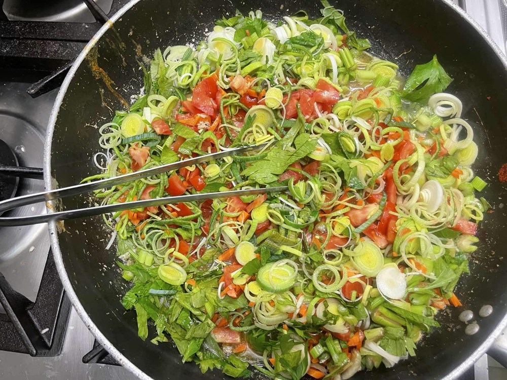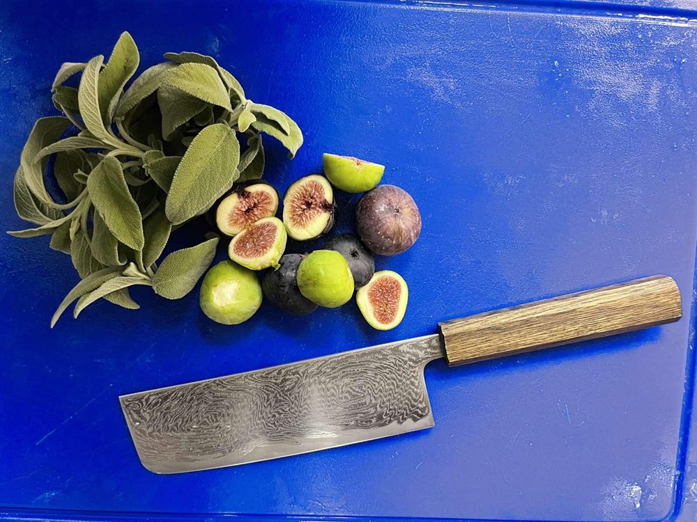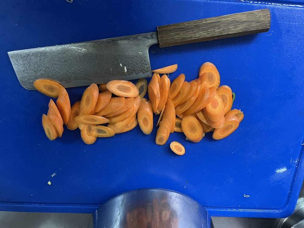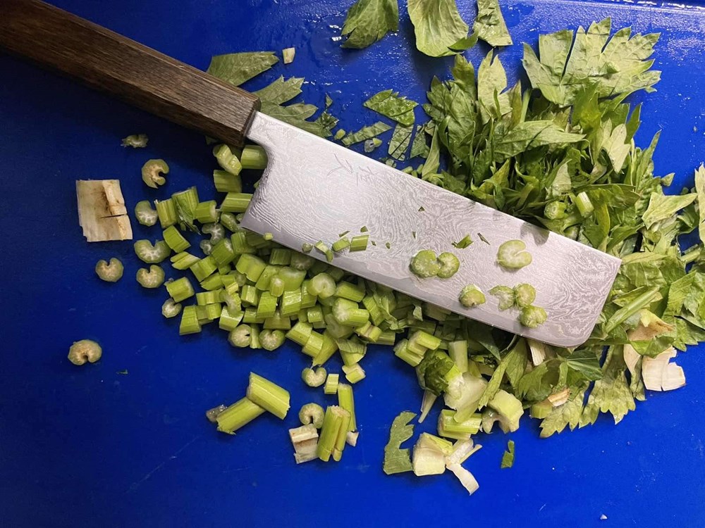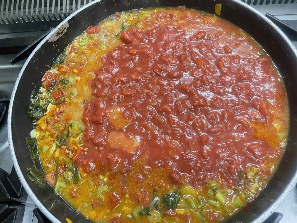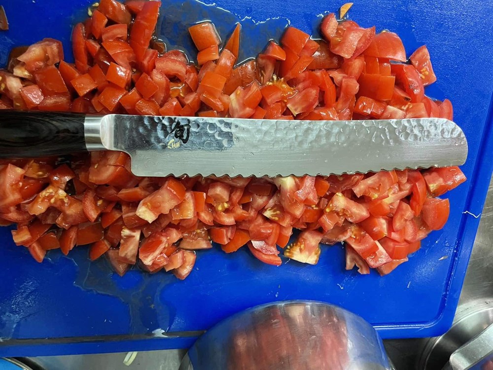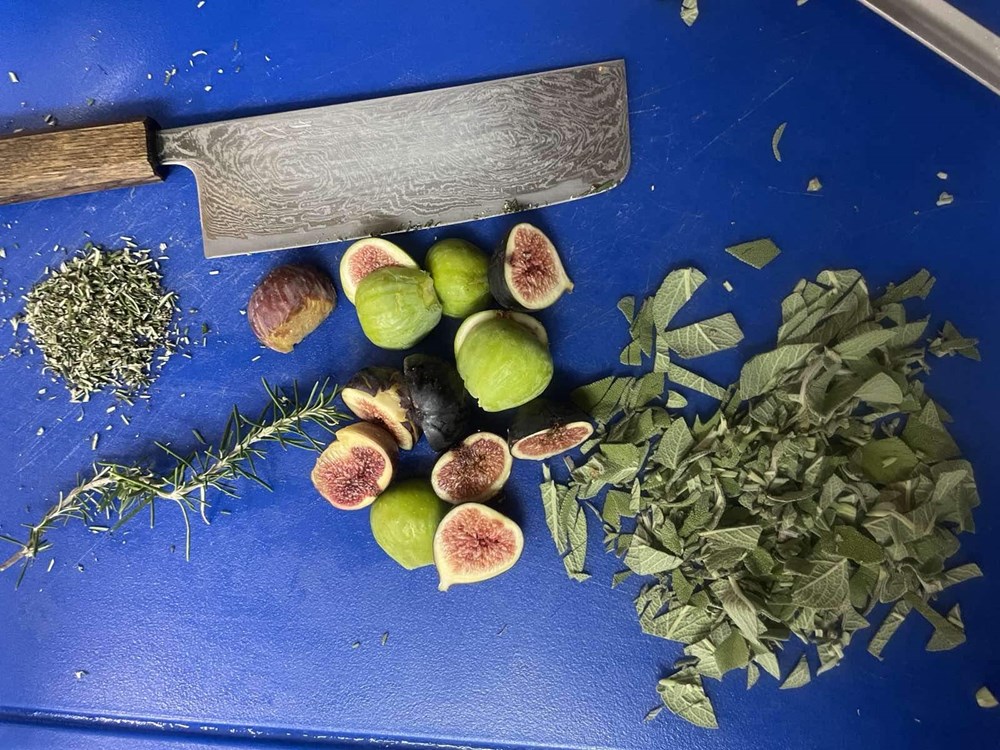 U međuvremenu pomidor narežemo na kockice pa ga ubacimo u veću zdjelu, zatim poriluk i stabljike celera narežemo na kolutiće, smokve na polovice, listove lavande na trakice, a mrkvu na kose kolutiće, te otvaračem za konzerve otvorimo konzervu polpe od pomidora.