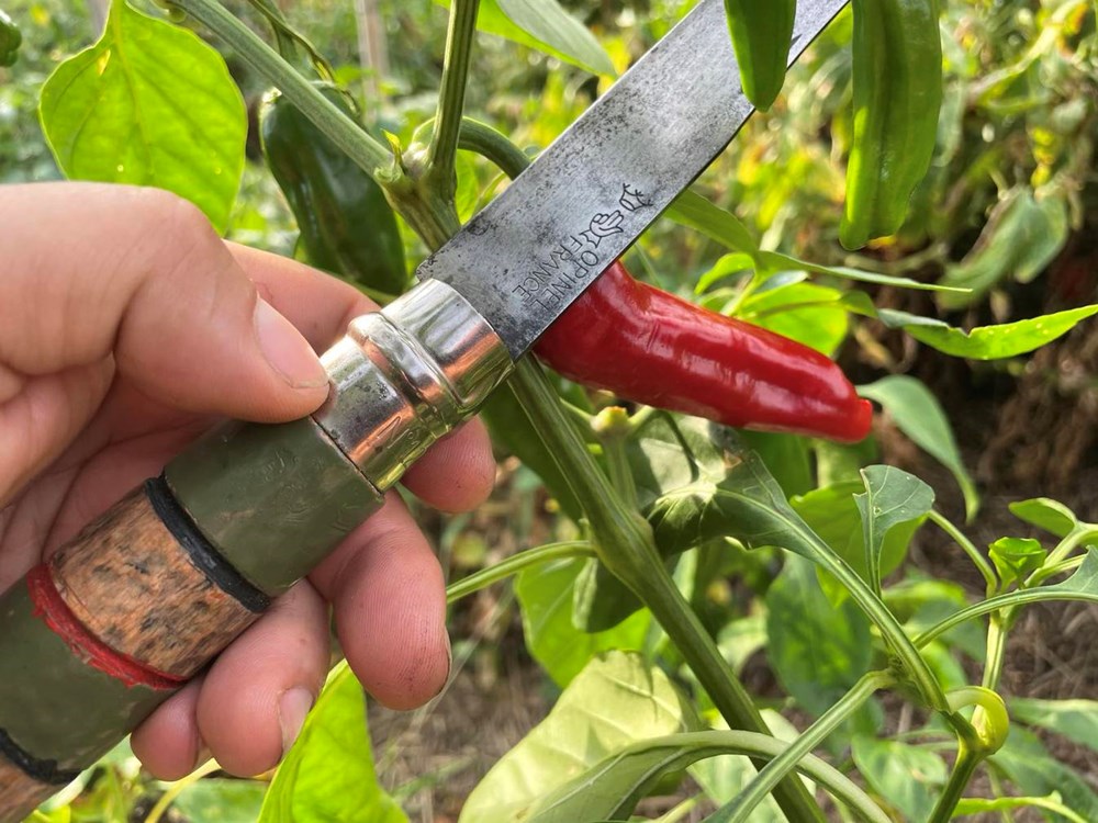 Tu raste gurmanska strast, i volja za životom. Pomidor, paprika, tikvica i melanzan. Uzimam svog oldschool Francuza "Opinela" taj dobri stari džepni nož nikada me nije iznevjerio... režem peteljku od paprike, jednu crvenu, jednu zelenu.