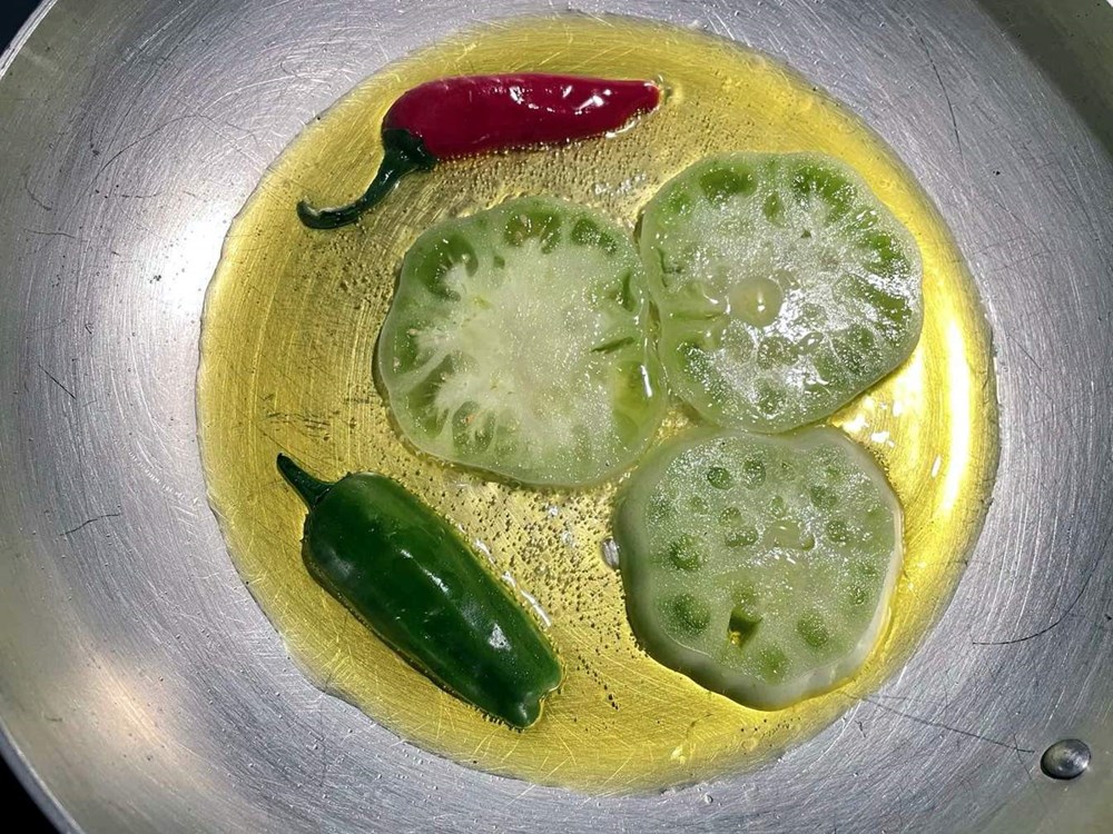 Na tavi s vrelim maslinovim uljem najprije pržimo fete zelenog pomidora i polovice paprike.
