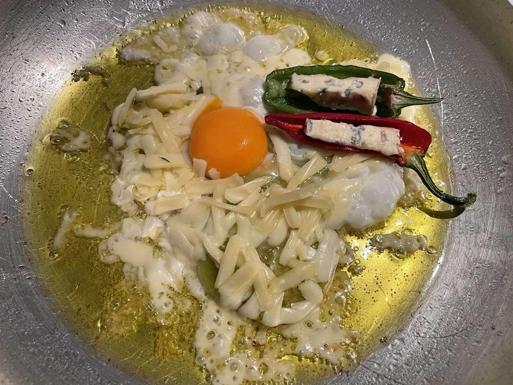 Odmah nakon toga po bjelanjku jajeta, dok je još sluzav dodamo na krupno naribane gaude sve oko žumanjka ali ne po njemu. Kako se bjelanjak bude uslijed djelovanja povišene temperature bijelio i stiskao, istovremeno će sir postajati mekši i širit će se, tako ćemo dobiti jednu sasvim drugačiju strukturu bjelanjka.