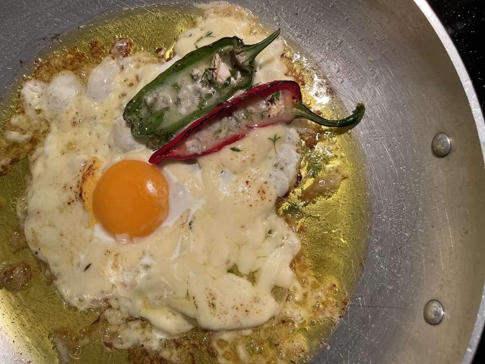 Kada polovice paprike i pomidor dobiju blago smećkastu koricu s jedne i druge strane, papriku stavimo uz rub tave, a po fetama zelenog pomidora, koji se i dalje prži u maslinovom ulju stavimo jaje na oko.