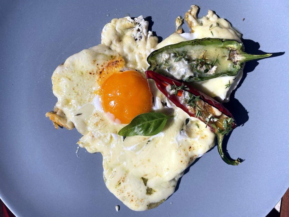 Na takav bjelanjak par minuta prije kraja pečenja stavimo dvije polovice slatke paprike, punjene mrvicama gorgonzole, koja se isto tako unutar paprike rastopila. Nekoliko minuta zatim, kada žumanjak bude gotov a sir unutar njega bude topljen, maknemo sve s izvora topline i stavimo na plitak tanjur... zarežite nožem, nabodite vilicom , ubacite u usta i uživajte... analizirajte nepcem, kako li se samo sljubljuje slatkasta kiselost zelenog pomidora, s blagom gorčinom pržene paprike, gaudom i gorgonzolom... jaje ovdje ima ulogu neutralnog smirivatelja jakih okusa poput paprike i gorgonzole, a usput nam daje snagu i energiju za tijelo i mozak. Također ste primijetili da je jaje nepravilnog oblika, nije klasičnog kao neki oblačić, i nisam koristio okrugli kalup. A i zašto bi... uživajmo malo u asimetriji... simetrije ionako ima previše u našim "civiliziranim" životima...