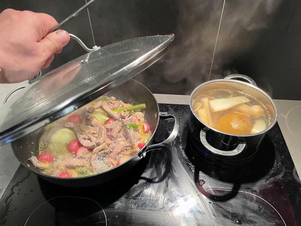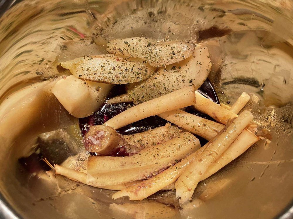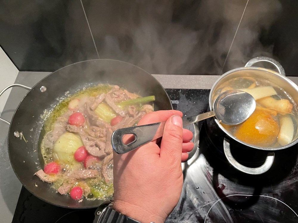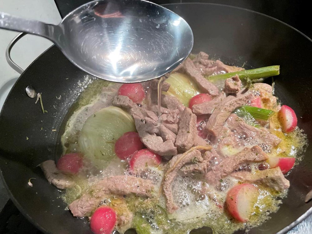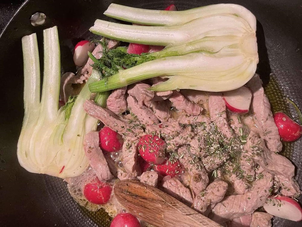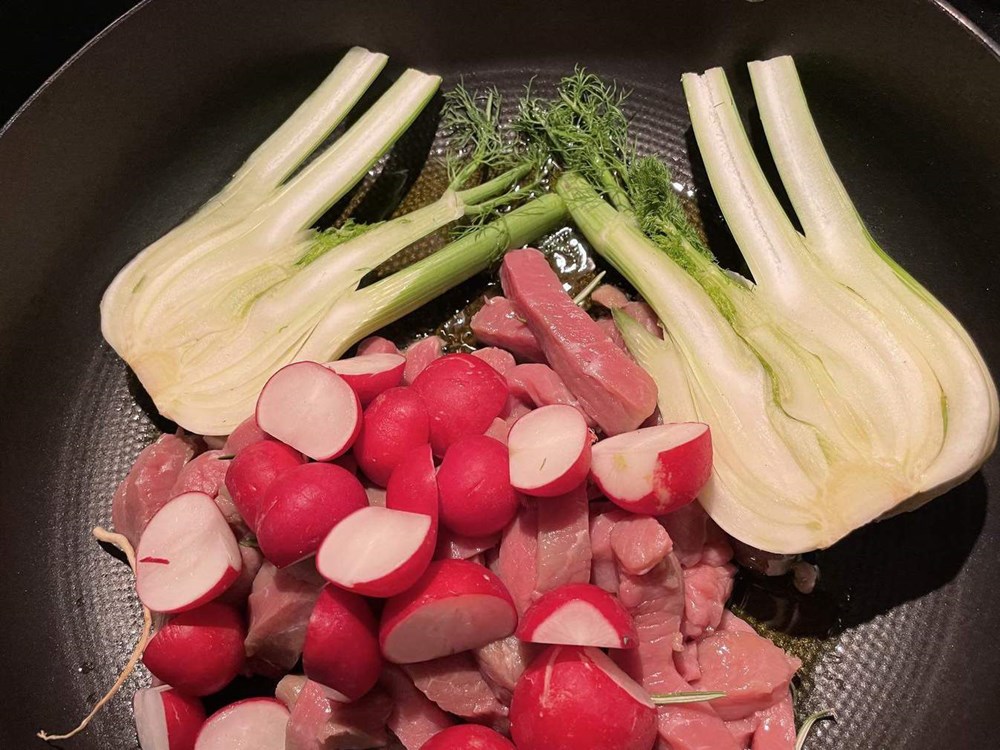 Istovremeno kada smo stavili kuhati u lonac krušku i celer, u poluduboku tavu na vrelo maslinovo ulje stavite trakice od janjetine, korijen komorača na pola i polovice rotkvica.