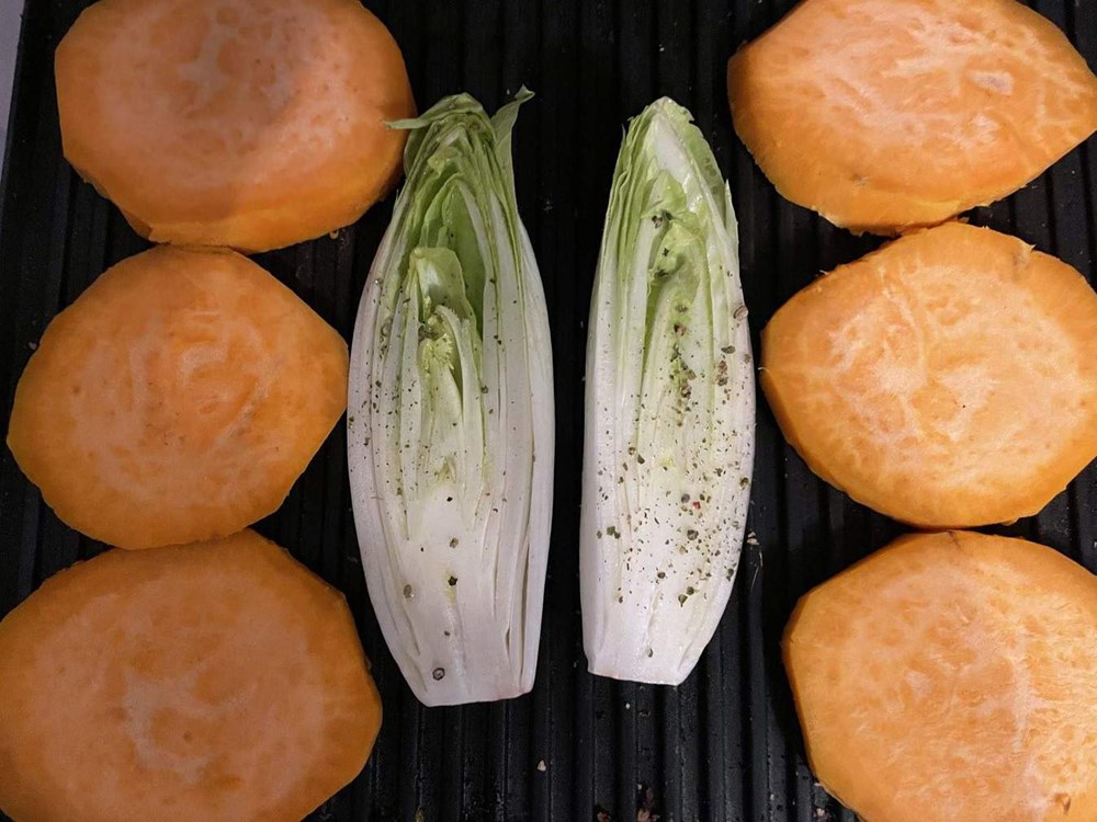 U manji lonac s kipućom vodom stavimo kuhati batat, neka se kuha dvadesetak minuta. Nakon dvadesetak minuta, izvadimo batat iz lonca ohladimo ga mlazom hladne vode iz špine, ogulimo mu koru te isječemo na kolutove različitih debljina. U zagrijani toster stavimo batat narezan na kolutove i glavicu cikorije razrezane na pola premazanu maslinovim uljem s malo mljevenog zelenog papra po sebi.