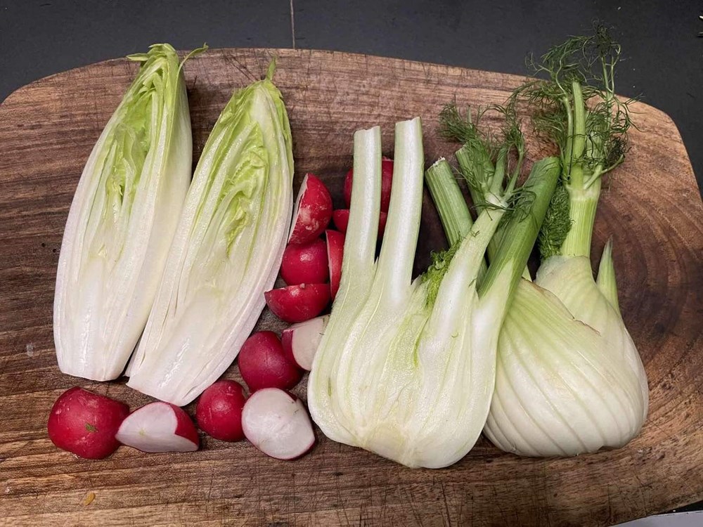 Oštrim nožem janjeći but narežemo na trakice; cikoriju, komorač, rotkvice razrežemo na polovine, celer na veće dijelove a iglice ružmarina usitnimo na što sitnije komadiće.