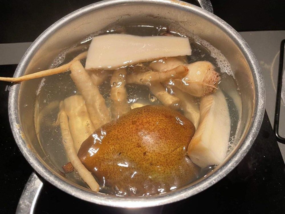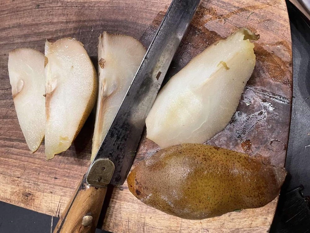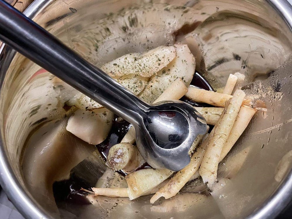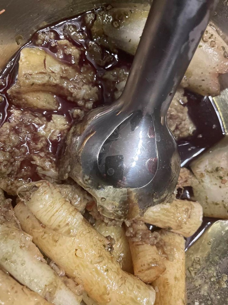 Lagano ih pržite uz miješanje drvenom kuhačom. Nakon nekih 7 minuta dodajte po svemu sitno nasjeckan ružmarin, čajnu žličicu soli, čajnu žličicu friško samljevenog zelenog papra i dvije do tri velike žlice vode u kojoj se u susjednom loncu kuhaju kruška i celer.
