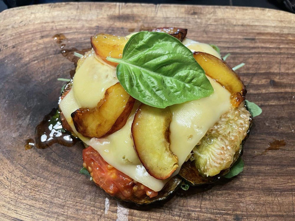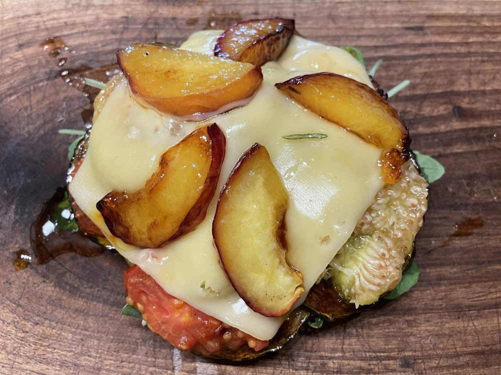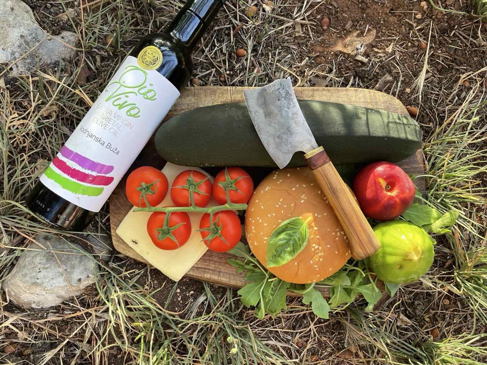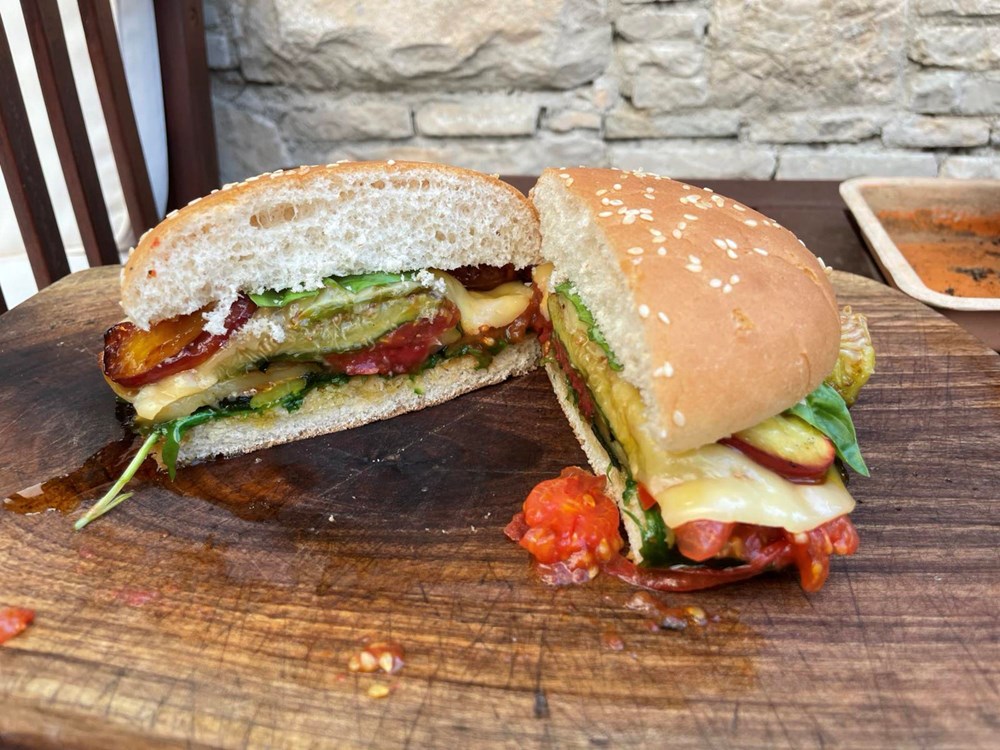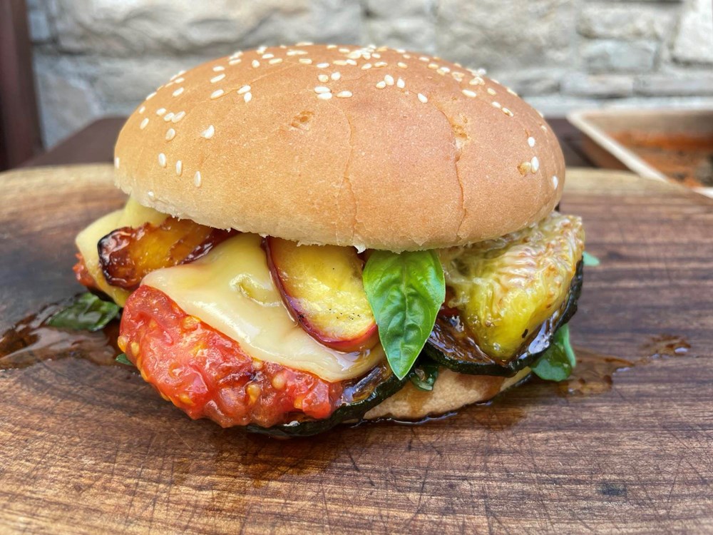Nastavimo dalje - nakon 3 do 5 minuta nakon što je naše povrće i voće sprženo na začinima i maslinovu ulju, odmah počinjemo proces slaganja u hamburger pecivo. Prvo na donju polovicu peciva stavimo pola šake svježe rokule, zatim po njoj stavimo tikvicu, na tikvicu stavimo cherry pomidor sa bosiljkom, na cherry pomidor stavimo dvije polovice smokve, na smokvu stavimo sir gaudu, po siru gaudi posložimo fete nektarinke koje smo pržili na ružmarinu i medu i preko svega stavimo par listova svježeg bosiljka i par kapi maslinovog ulja. Poklopimo s gornjom polovicom peciva i naš je vege burger spreman za konzumaciju… uživajte u izdvojenim okusima koji se ipak sljubljuju… Dobar vam tek dragi ljudi… vaš Outlaw…