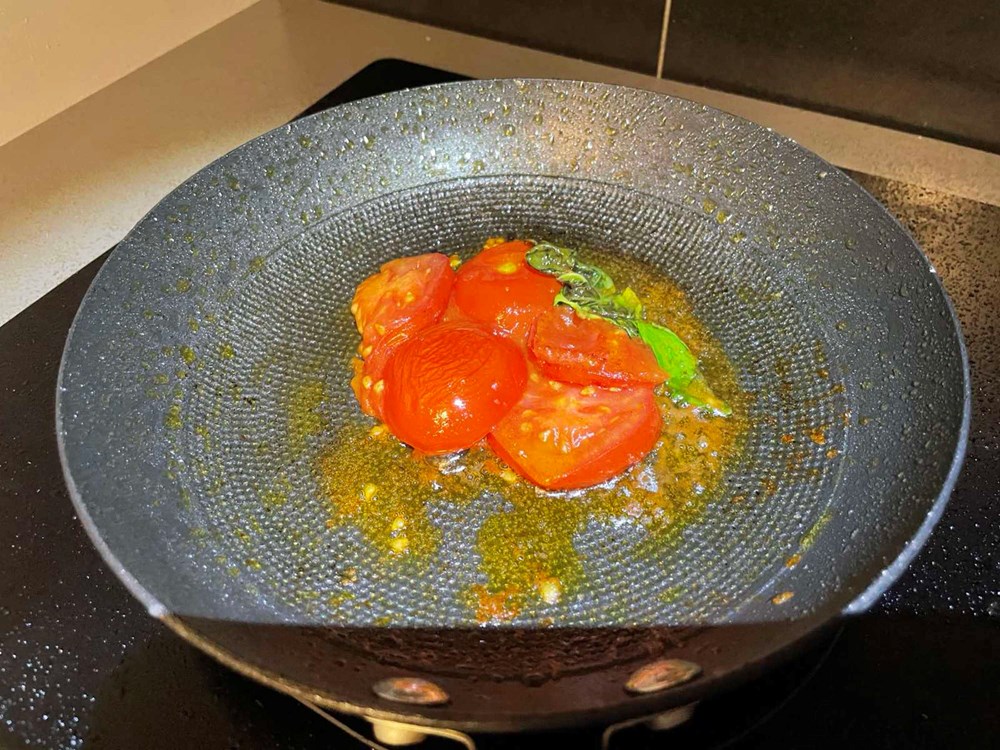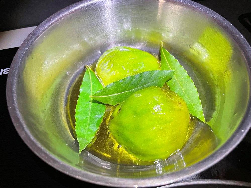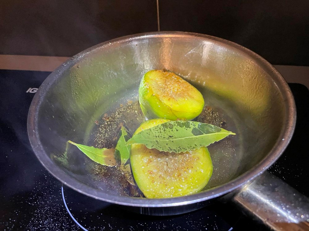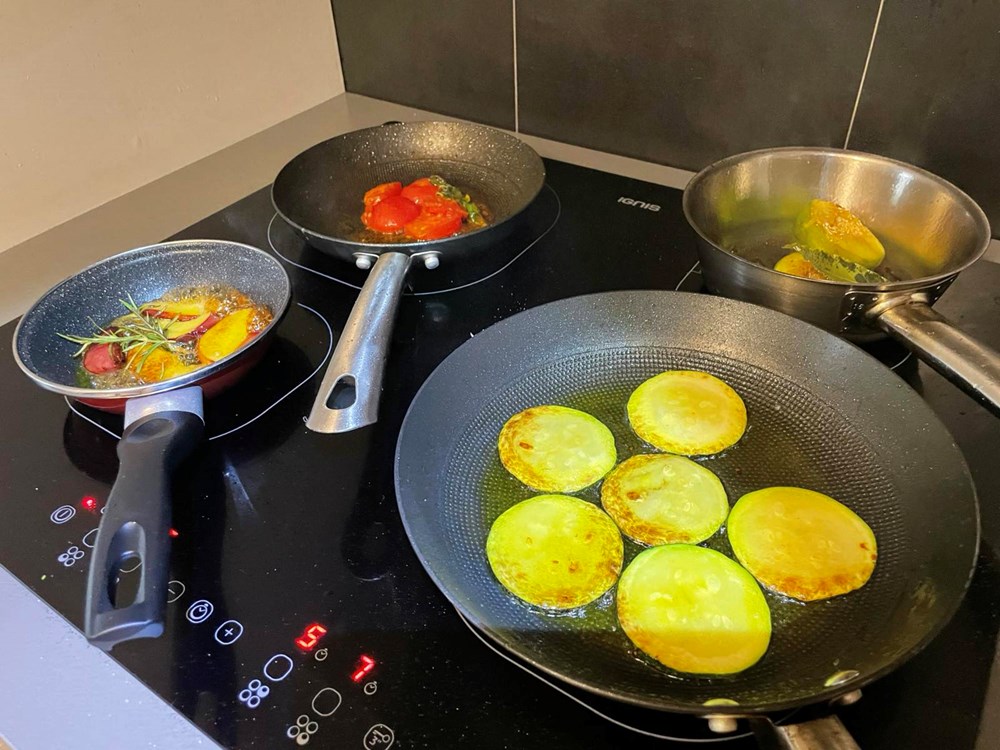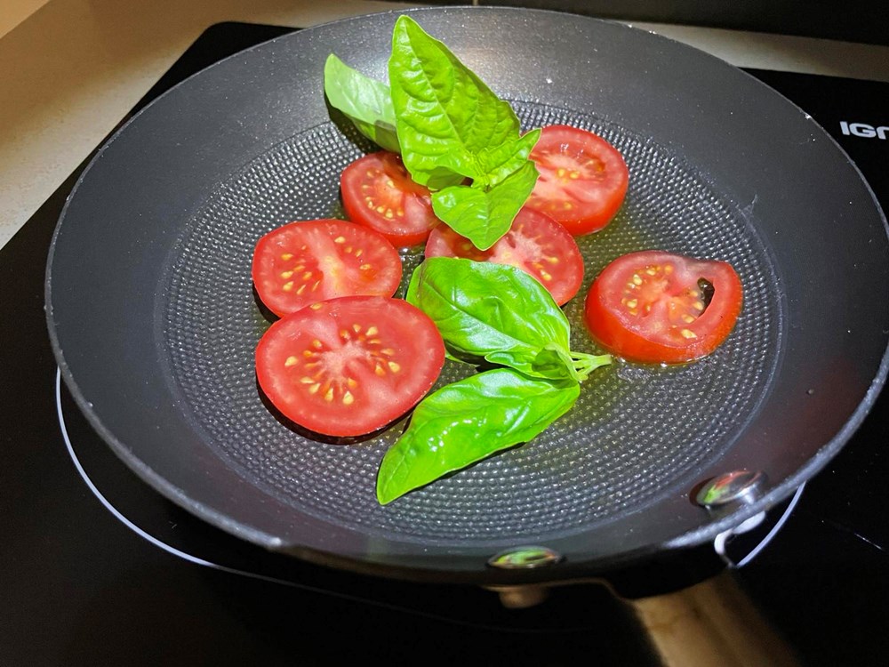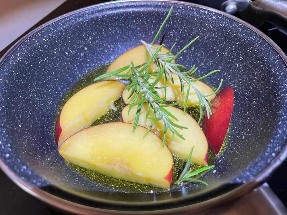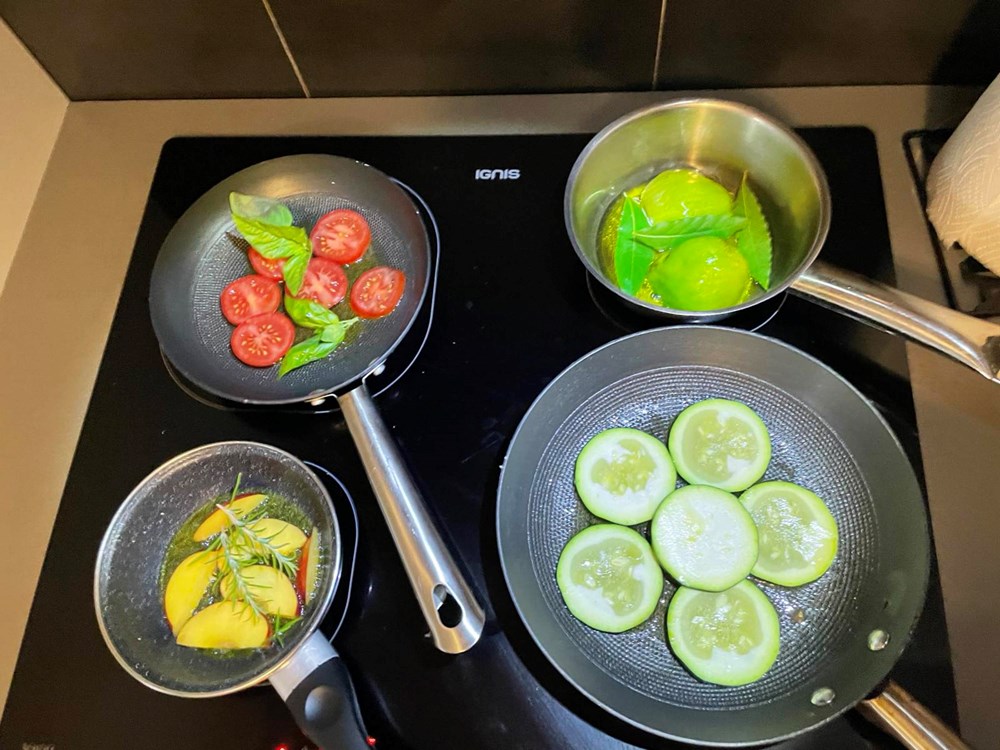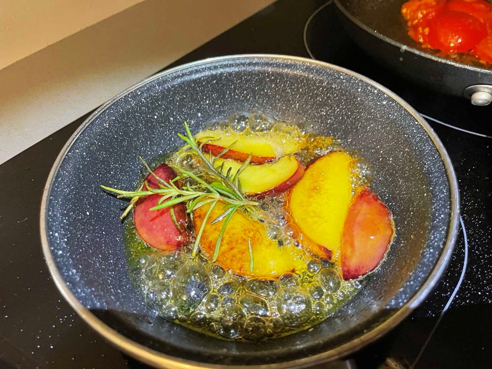 U četiri izdvojene tave na vrelo maslinovo ulje stavite pržiti sljedeće namirnice: u tavu broj 1 stavite pržiti pomidor s bosiljkom i malo soli, u tavu broj 2 stavite peći smokvu prerezanu na pola s par listova lovora i trećinom čajne žličice friško samljevenog papra, u tavu broj 3 stavite peći nektarinku s ružmarinom i čajnom žličicom meda, u tavu broj 4 samo tikvicu na maslinovom ulju.