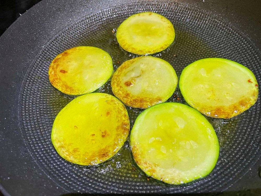 U izdvojenim tavama pržimo s odvojenim začinima tako da svaki komad povrća i voća ima svoj izolirani okus, tikvica je tu neutralna, ona kao i maslinovo ulje u ovom jelu ima ulogu sljubljivanja… cmok, cmook!