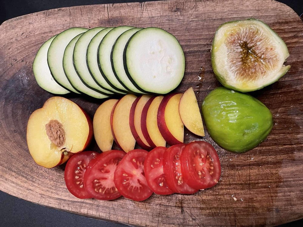 Oštrim nožem narežite na fetice pola tikvice, dva cherry pomidora i pola nektarinke. Smokvu narežite na pola.