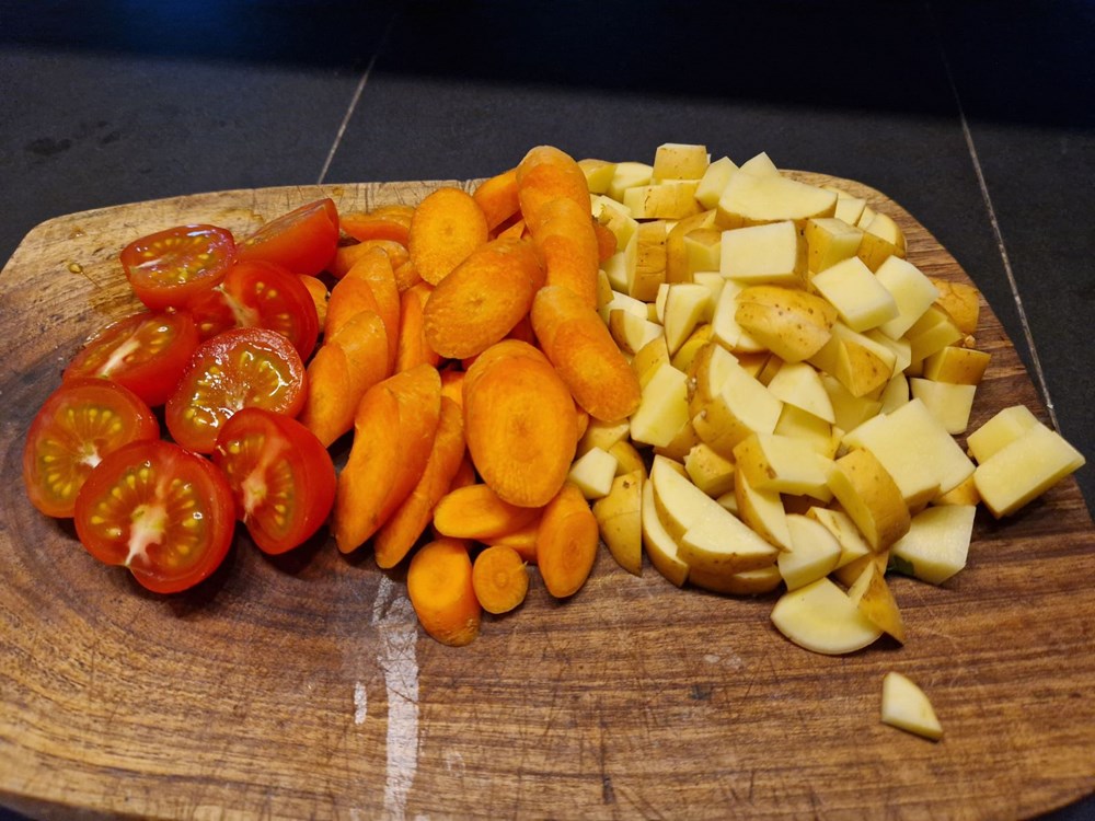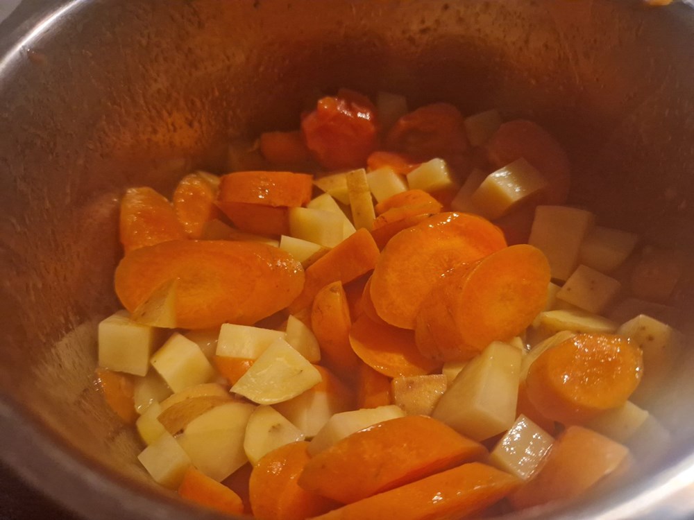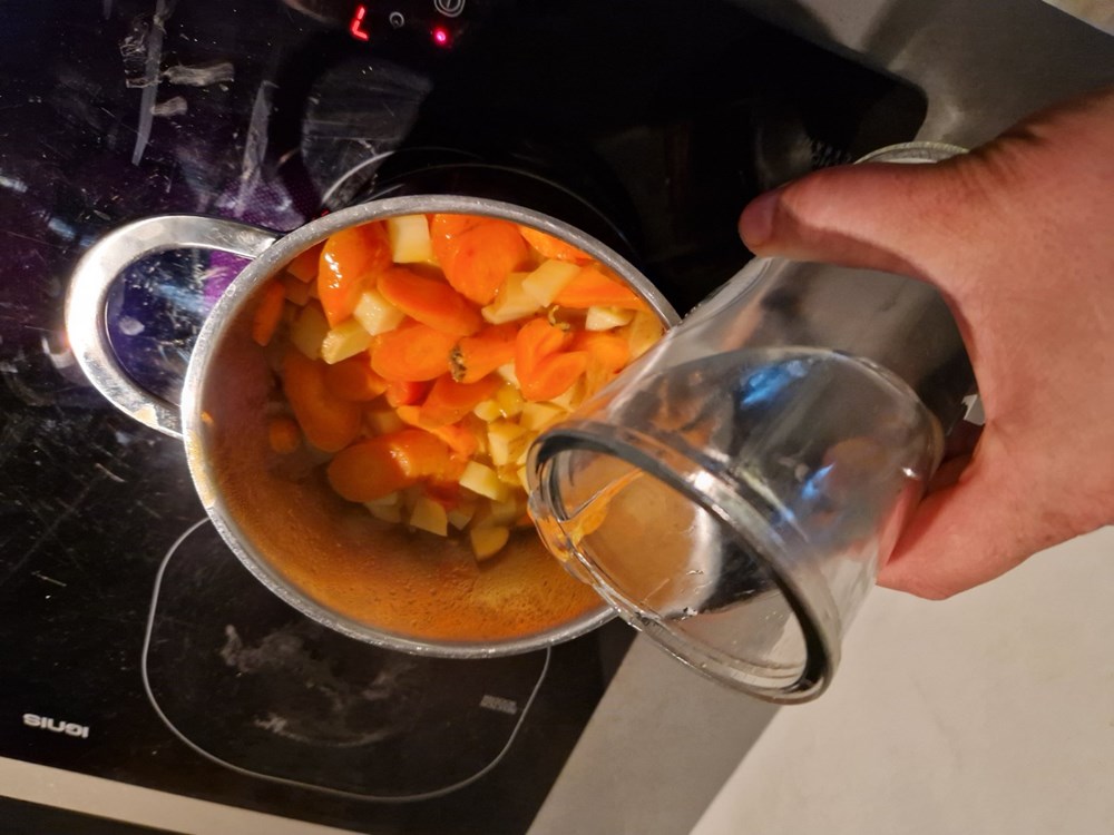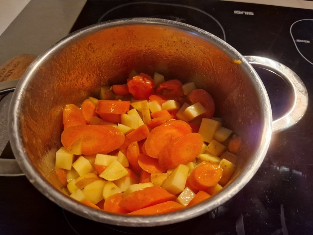 U manjem loncu od cca 1,5 do 2 l zapremine na vrelom maslinovom ulju lagano pržite uz konstantno miješanje krumpir, mrkvu i cherry pomidor. Nakon nekih pet minuta kada se pomidor smekša dodajte 1 l vode.