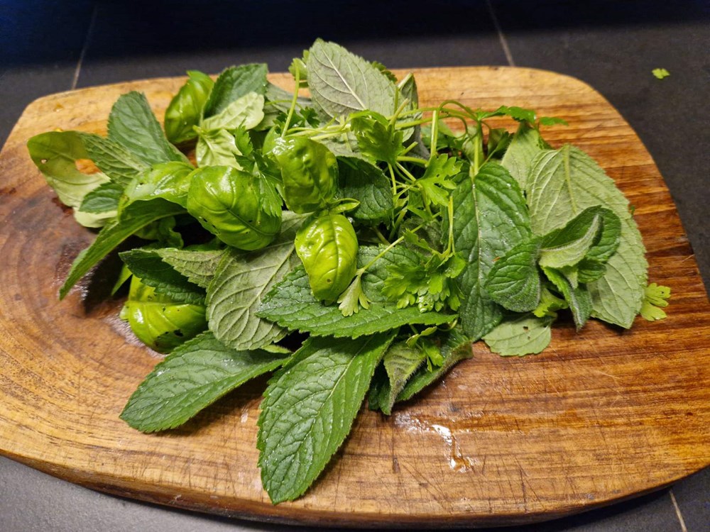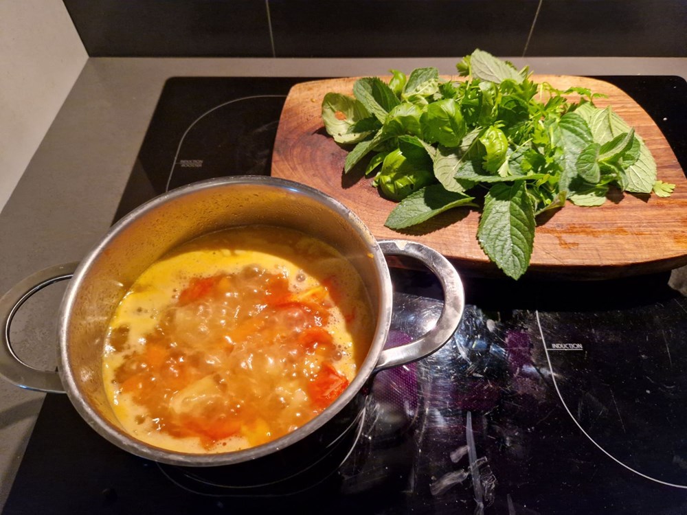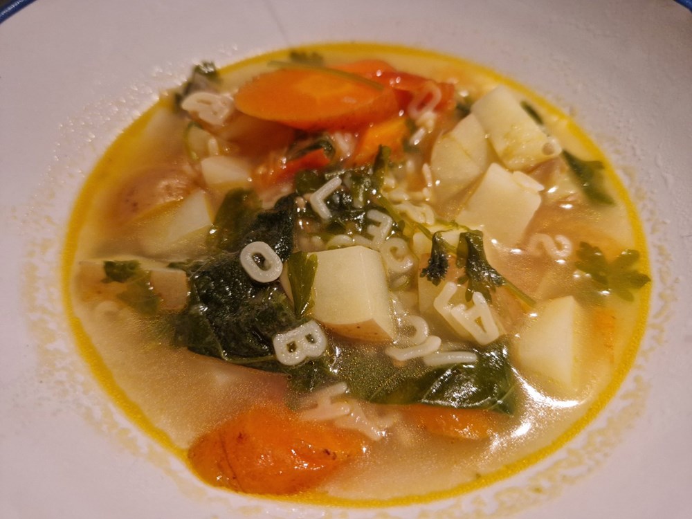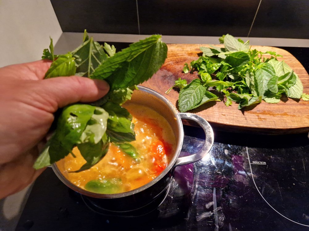 Kada voda u loncu zakipi, dodajte listove mente, bosiljka i peršina te jednu čajnu žličicu krupne nejodirane morske soli. Nakon 5 do 7 minuta kuhanja dodajte dvije jušne žlice tjestenine za juhu u obliku slova.