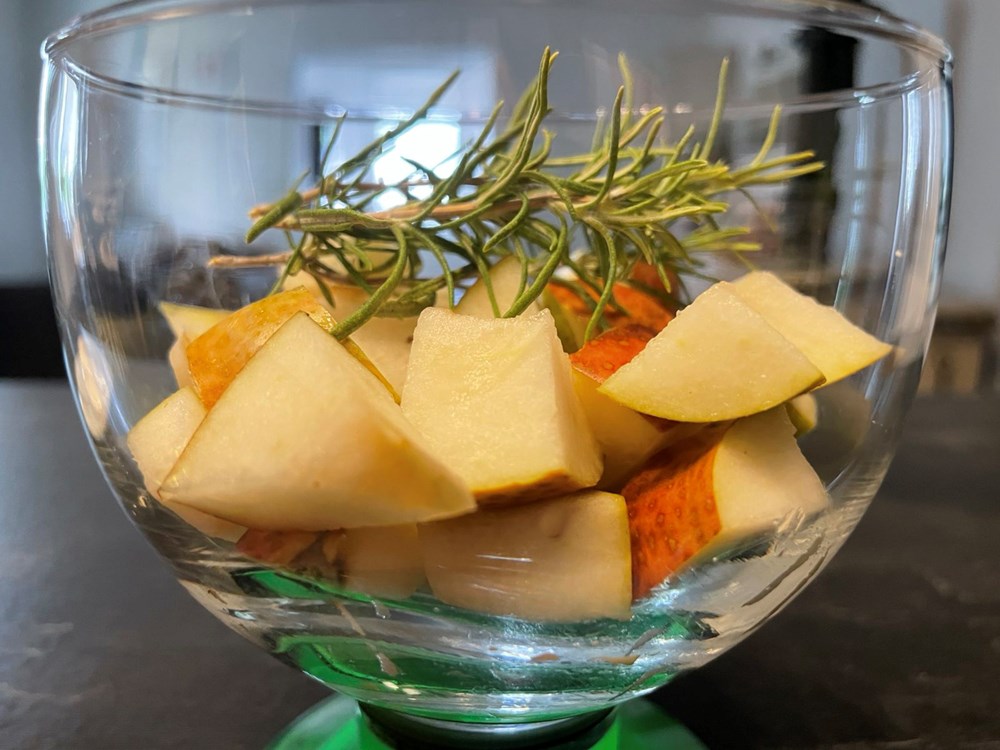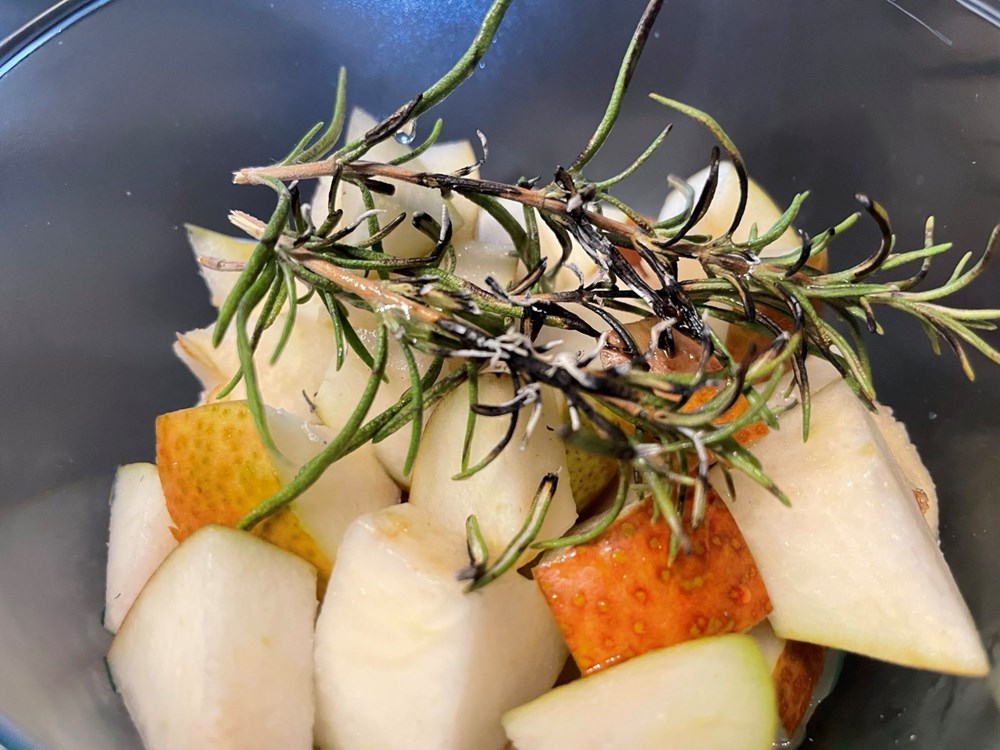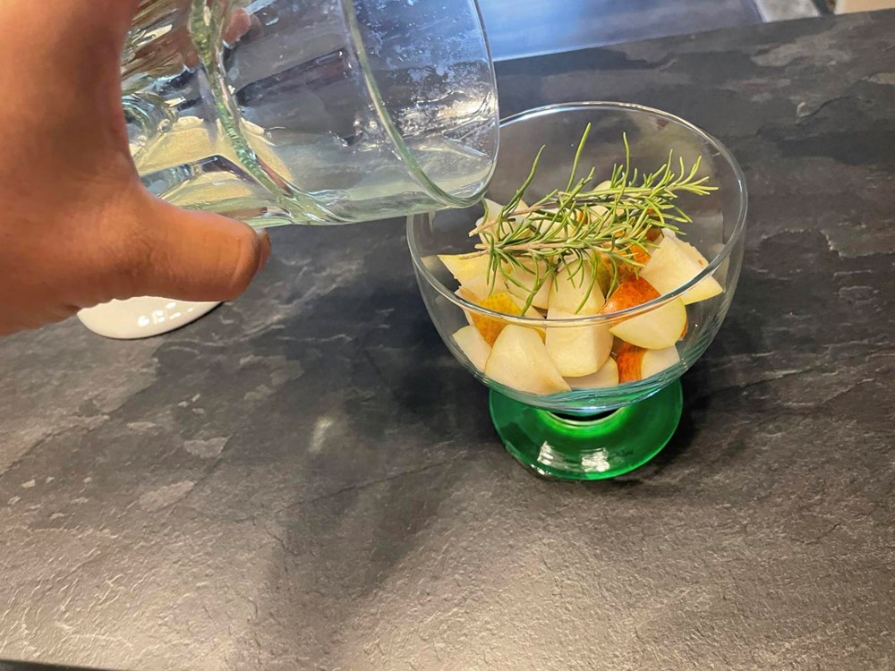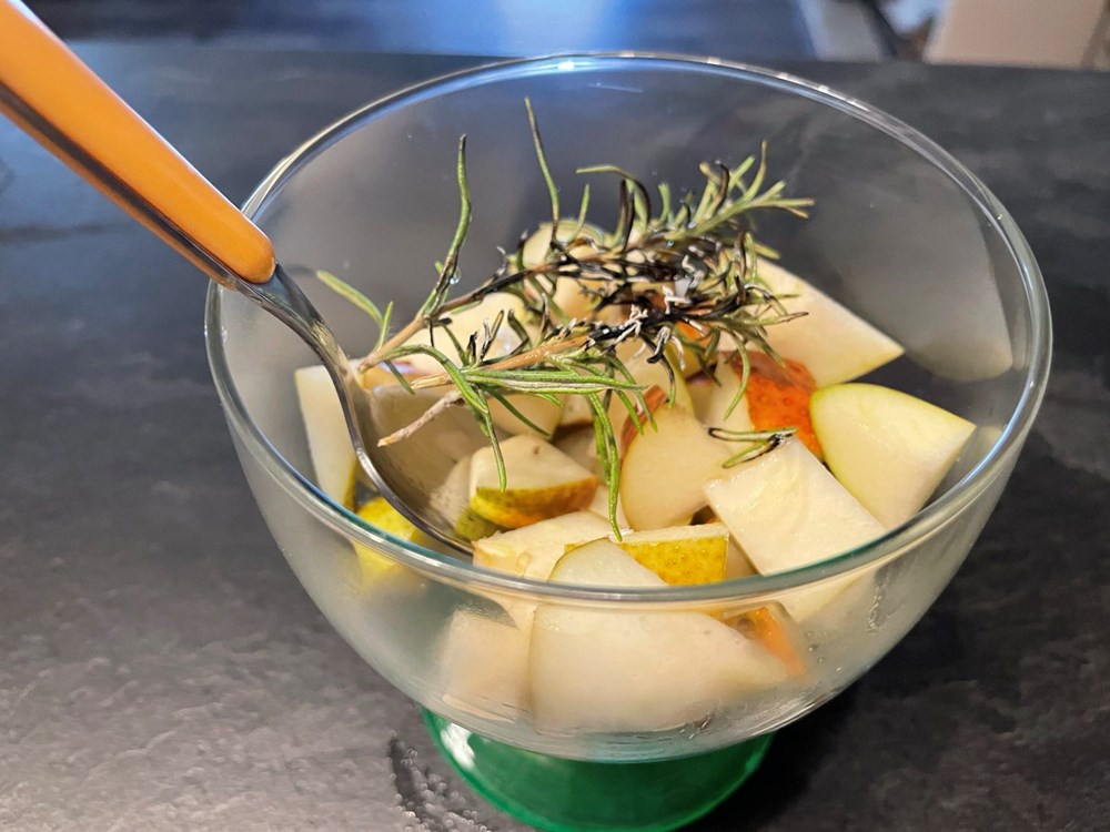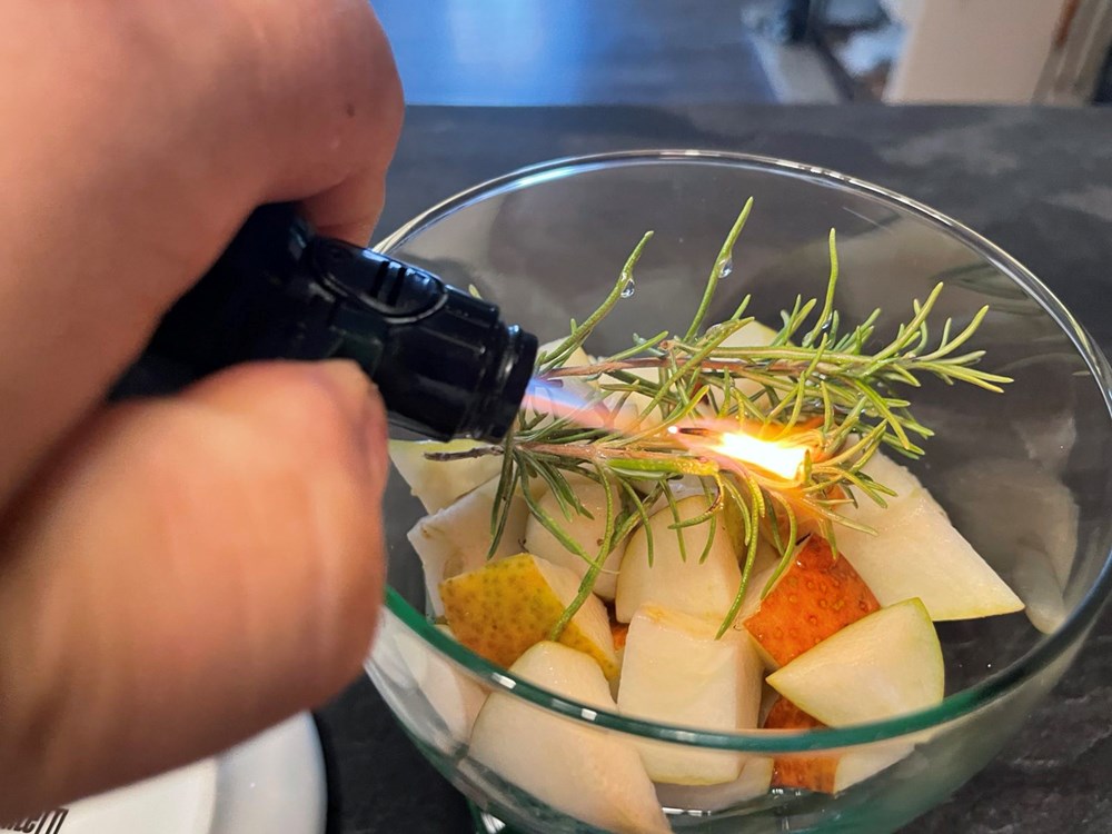 Na kockice od kruške u čaši stavimo grančicu ružmarina pa sve to u čaši prelijemo sokom od limuna, meda i maslinova ulja. Zatim džepnim brenerom ili običnim upaljačem zapalimo grančicu ružmarina. Kada listovi ružmarina počnu gorjeti i dimiti se čašu poklopimo tanjurićem od šalice za kavu. Sada se u čaši stvorila "aromatićna izmaglica" od dima koji je izašao iz ružmarina.