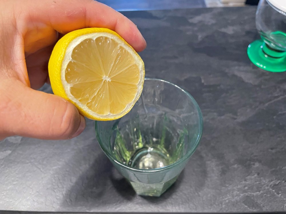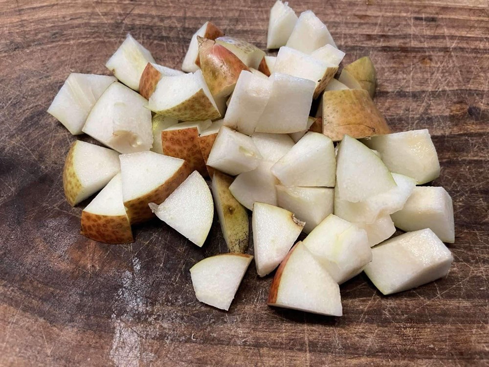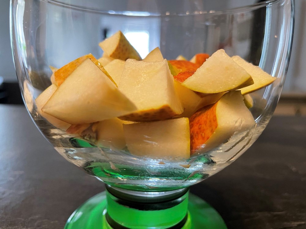 U čaši izmiješamo jušnu žlicu meda s limunovim sokom od 1/2 limuna i jednom čajnom žlicom maslinovog ulja. Krušku očistimo od peteljke i koščica, narežemo ju na kockice nešto veće od graška pa ih stavimo u staklenu čašu.