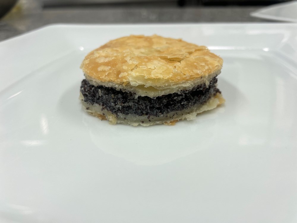 Zatim ulijte rastopljenu čokoladu u kalup, ako nemate kalup, možete iskoristiti ambalažu stare bombonjere ili pekarski papir. Dobivenu pralinu stavite 2 sata da odleži i stvrdne se u škrinji pa ju nakon toga izvadite i spojite na način da između praline i štrudle s makom stavite kremu od vanilije cca 1 prst debljine pa pralinu onda pritisnite u štrudlu dok ne sjedne na nju a krema ne iscuri svugdje naokolo.