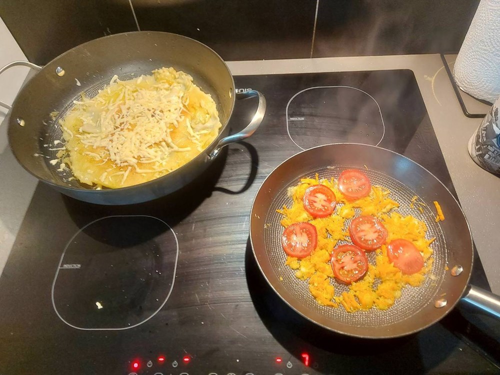 Kada povrće dobije laganu žućkastu koricu preko svega prelijemo jaje na oko, te ga posolimo. Kada bjelanjak oko žumanjka počinje bijeliti i stvrdnjavati se po njemu okolo, ali ne i po žumanjku pobacamo cca 5 dkg gaude, pa maknemo s izvora topline.