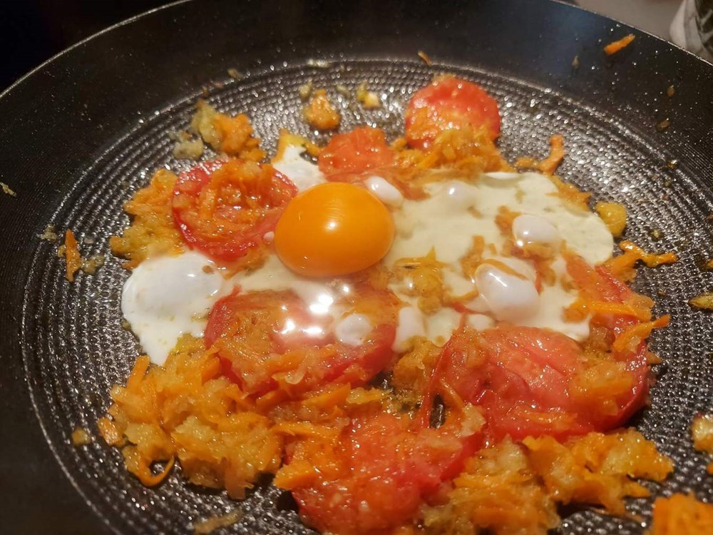 Zatim na zagrijanom ulju prvo lagano ispržimo pola glavice naribanog luka i naribanu mrkvu, nakon 2 minute dodamo pomidor narezan na tanke kolutiće da se prži...