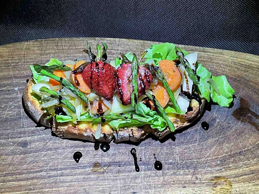 Po tostiranom kruhu prvo posložite zelenu salatu narezanu na deblje fete, po njoj poslažite ovčji sir, a po ovčjem siru posložite prženu mrkvu i luk. Na prženu mrkvu i luk na sredinu tosta postavite dvije polovice jagoda pa preko svega pobacajte šparuge… poprskajte sve s nekoliko kapi maslinovog ulja i "išarajte" sve reduciranim acetom balsamicom…