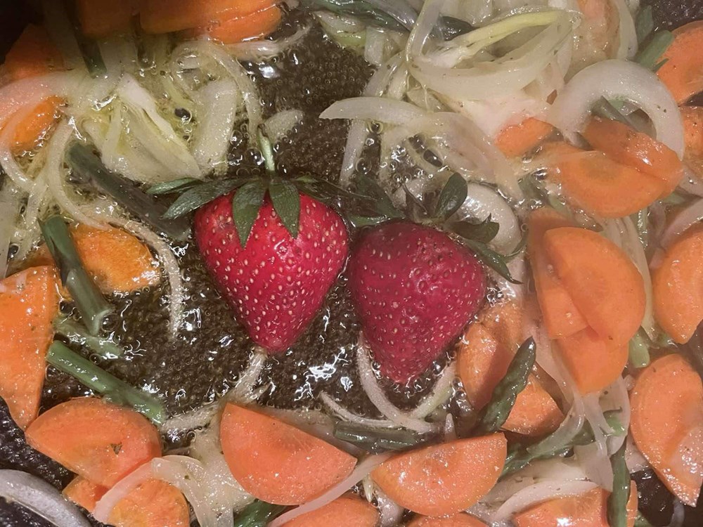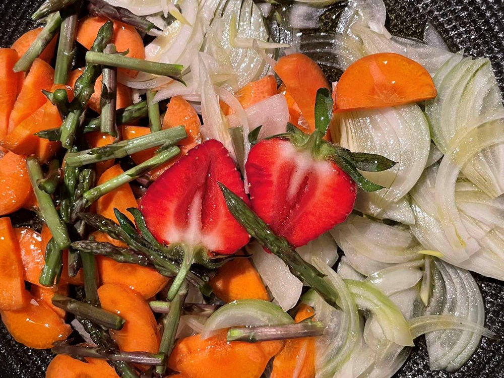 U tavu na vrelo maslinovo ulje stavite peći luk, mrkvu, šparoge i jagode, nakon 2 minute pečenja dodajte čajnu žličicu krupne nejodirane morske soli i friško samljeveni zeleni papar.