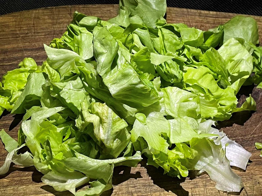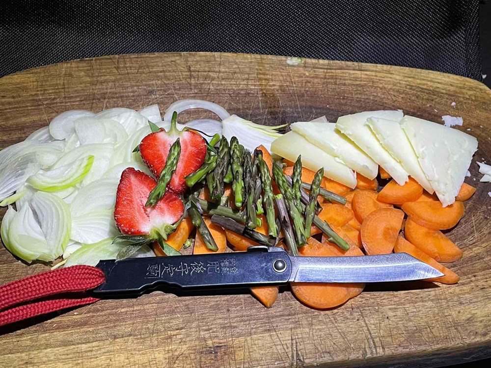 Izrežite dvije fete kukuruznog kruha, mrkvu narežite na kolutiće pa te kolutiće na polovice, sir izrežite na trokutiće, iskidajte šparoge rukom dokle pucaju (mekani dio), jagode izrežite na polovice, luk izrežite na trakice, salatu izrežite na deblje trakice.