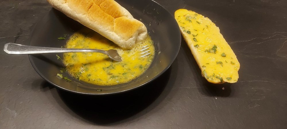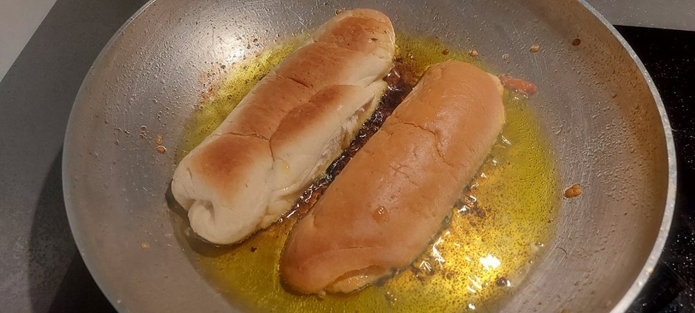 U tu smjesu umočimo unutarnje strane panina kojeg smo razrezali na pola, iste polovice ispržimo u plitkoj tavi na vrelom maslinovom ulju cca 4 minute pa ih stavimo sa strane.