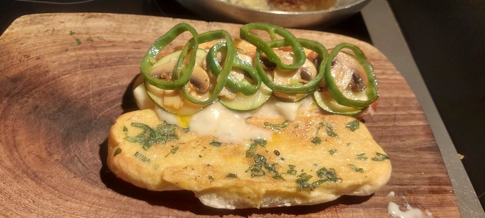 Isprženo povrće slažemo po paninu na sljedeći način: prvo stavimo prženi pomidor i dok je još vreli po njemu stavimo 10 dkg gorgonzole, po gorgonzoli stavimo šampinjone, a po šampinjonima stavimo kolutiće zelene paprike preko kojih stavimo ostatak smjese jajeta, bosiljka i maslinovog ulja kojeg smo kao fritaju spekli odmah nakon što smo izvadili povrće.