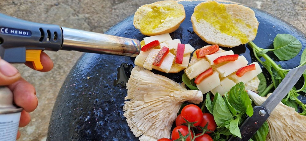 Zatim džepnim nožićem narežite ovčji sir na tanke štapiće, cherry pomidor na kolutiće a papriku na male kockice. Sir kojeg ste narezali položite na donju fetu kruha koju ste poprskali maslinovim uljem. Plamenom brenera lagano prelazite preko sira i paprike dok mjestimice ne posmeđe na svojim površinama.