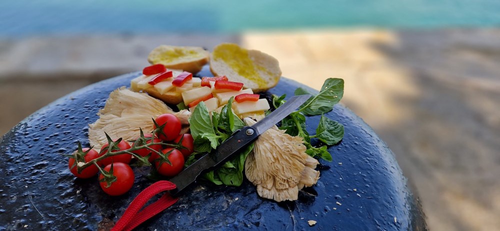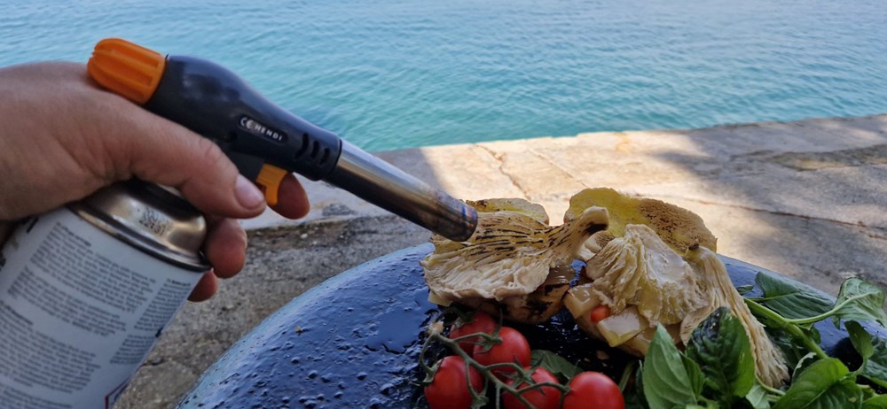 Bacam pregaču sa sebe, uzimam kuhinjski brener, dva stara peciva od jučer, bočicu najboljeg maslinovog ulja na svitu, uzimam dvije gljive bukovače, nekoliko cherry pomidora i komad tvrdog ovčjeg sira... jurim van kuhinje kroz stražnja kuhinjska vrata... TRASS!