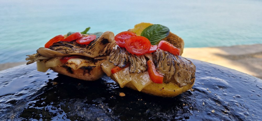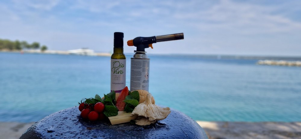 Nakon toga uzmite gljivu bukovaču, obje strane lagano poprskajte maslinovim uljem, te ju položite na kruh, zatim plamenom brenera prvo prođite jednu stranu dok lagano ne dobije smećkaste tonove (cca 30 do 40 sekundi po svakoj strani) pa to isto ponovite i s drugom stranom gljive.