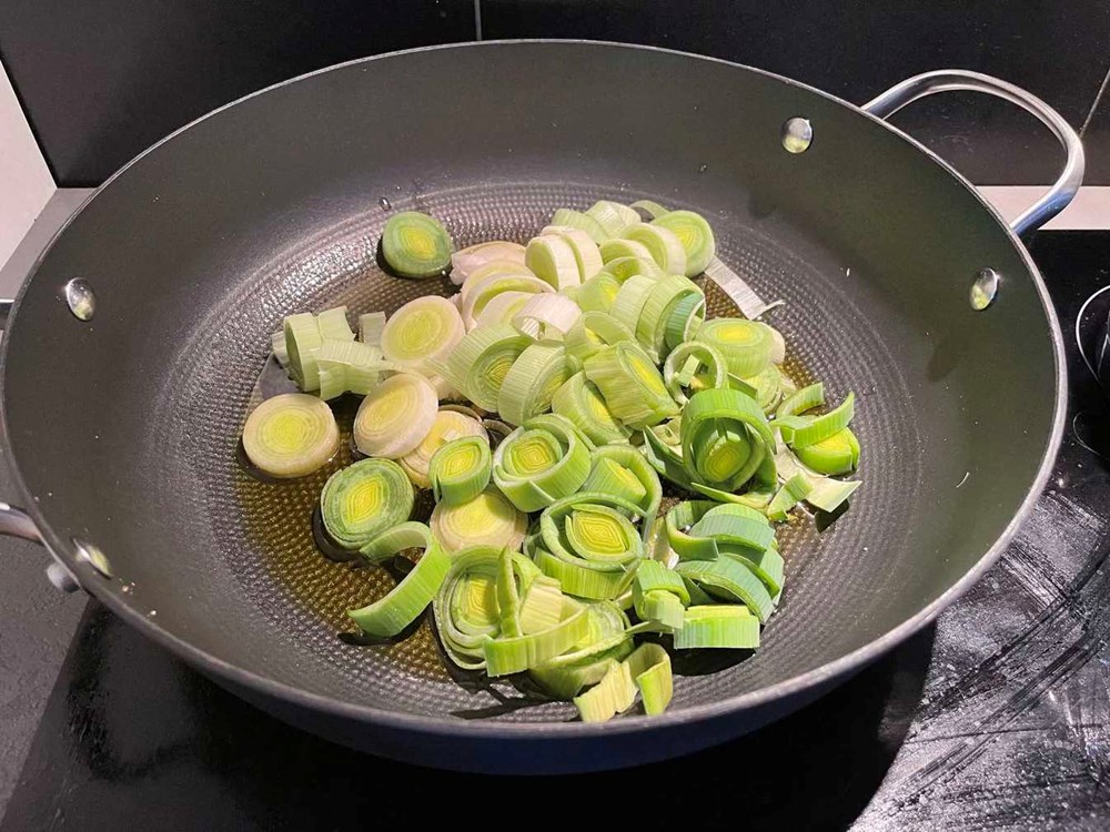 Poriluk narežemo na kolutiće pa ga pržimo na maslinovom ulju u poludubokoj tavi, nakon 3 do 5 minuta kad se poriluk omekša dodamo sol i papar i podlijemo s pola kaciole povrtnog temeljca. Nakon 5 do 7 minuta dinstanja poriluka u povrtnom temeljcu koji je već gotovo ispario dodamo 50-ak grama tune (jednu malu škatulu iliti konzervu).