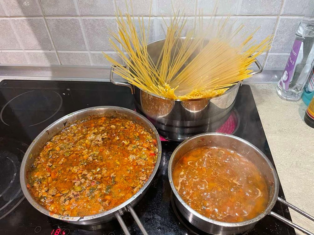 Sve ovo kuhamo još nekih 1,5 h na laganoj vatri uz povremeno miješanje i šugo Brionez je pronat. Petnaest minuta prije nego šugo maknemo sa vatre u lonac s kipućom slanom vodom stavimo kuhati spaghette, te ih nakon 15-ak minuta maknemo s vatre i procijedimo.