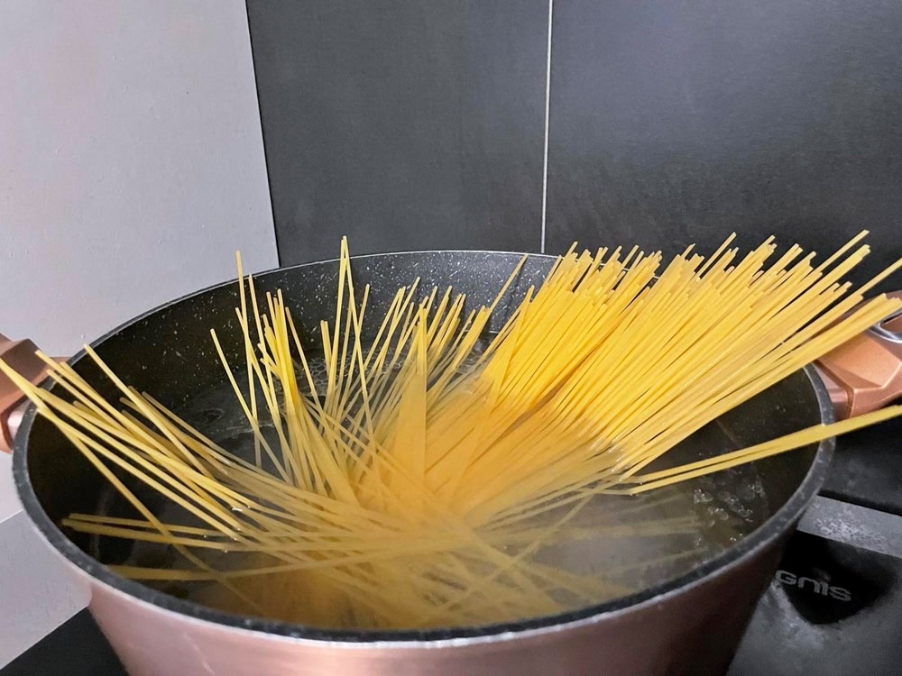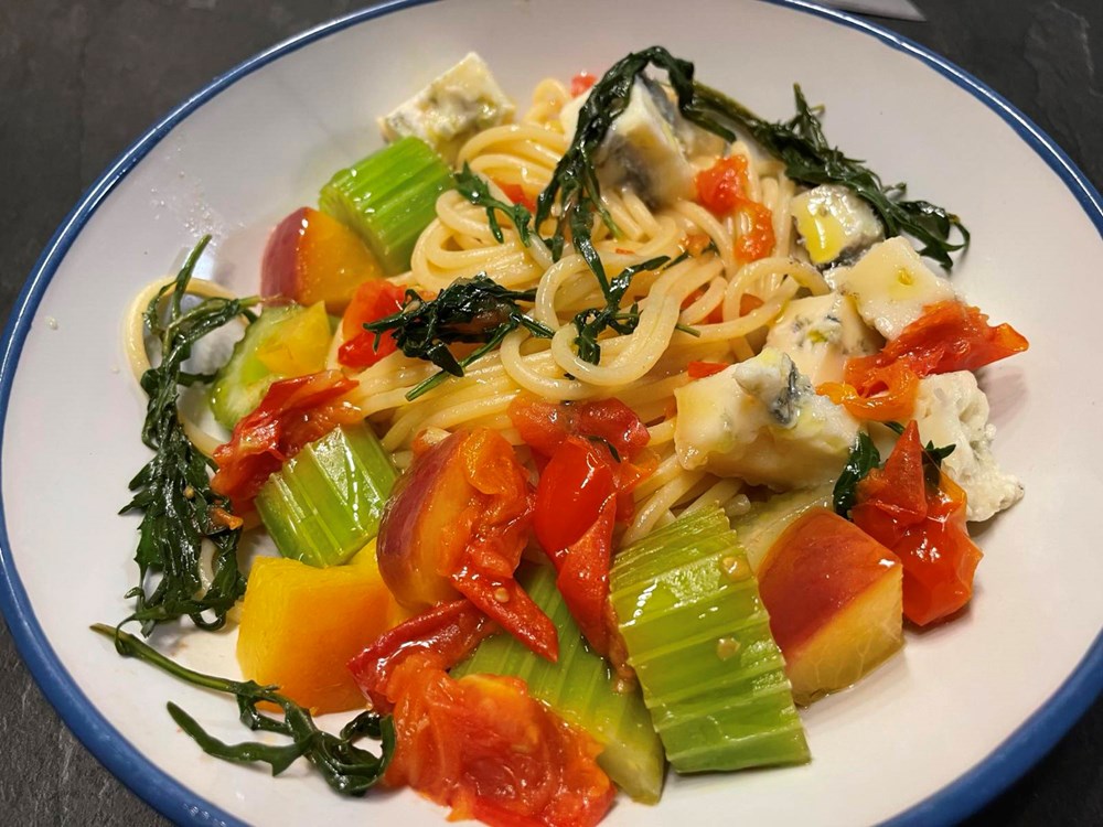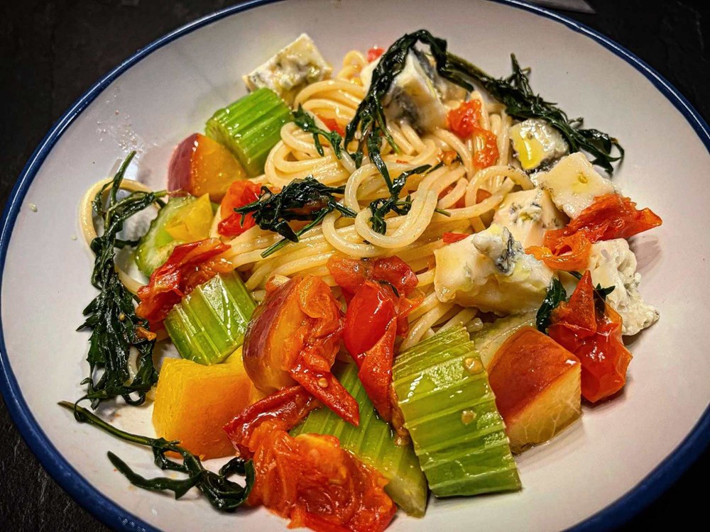 Nakon toga u tavu sa celerom, breskvom i rokulom ubacite skuhane špagete pa sve dobro nekih 60-ak sekundi izmiješajte pa maknite s izvora topline…