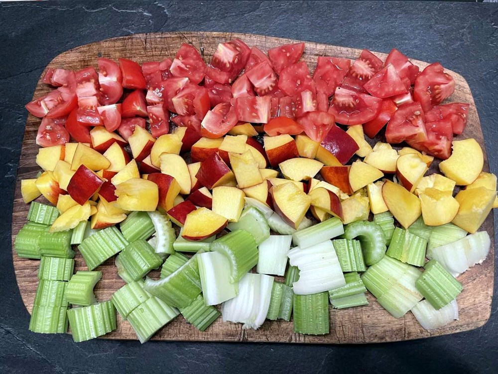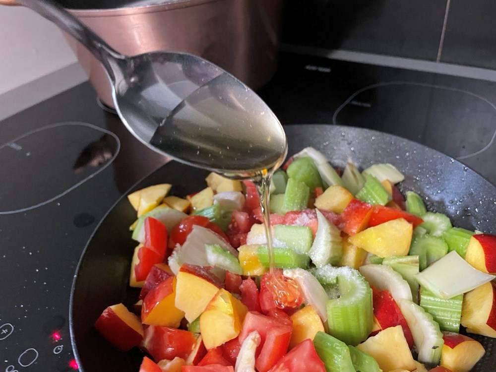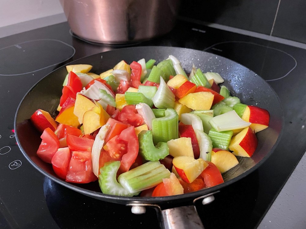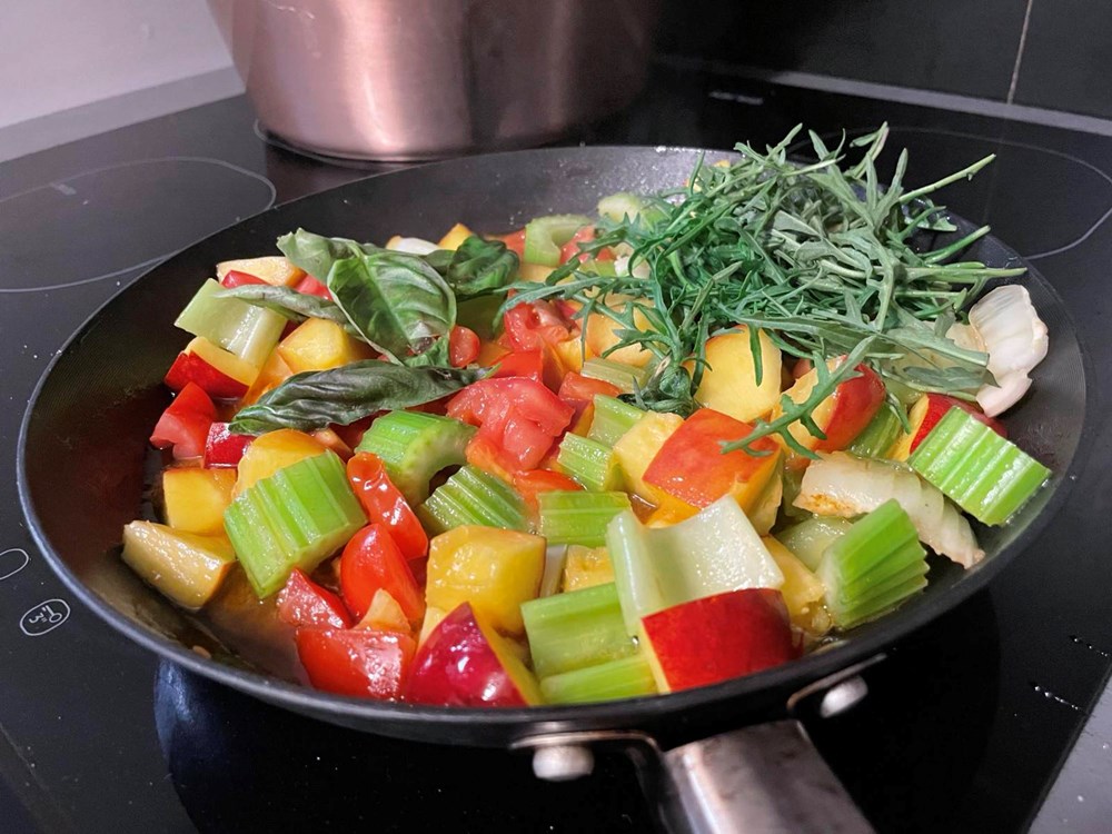 U vreloj slanoj vodi s par kapi maslinovog ulja skuhajte paštu, da bude al dente… procijedite ju… u tavi na vrelom maslinovom ulju pržite stabljiku celera, breskvu nektarinku, cherry pomidor - sve narezano na kockice. Nakon 4 do 5 minuta prženja kad je voće i povrće na pol mekano dodajte pola žlice meda, jednu čajnu žličicu cvijeta morske soli, 5 listova svježeg bosiljka i 10 dkg divlje rokule (možete i pitome kupovne, ja ju imam na livadi pa zato…), pa sve to uz lagano miješanje pržite na srednje jakoj vatri još nekih 4 do 5 minuta.