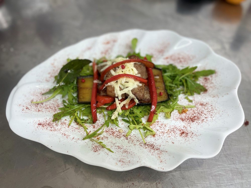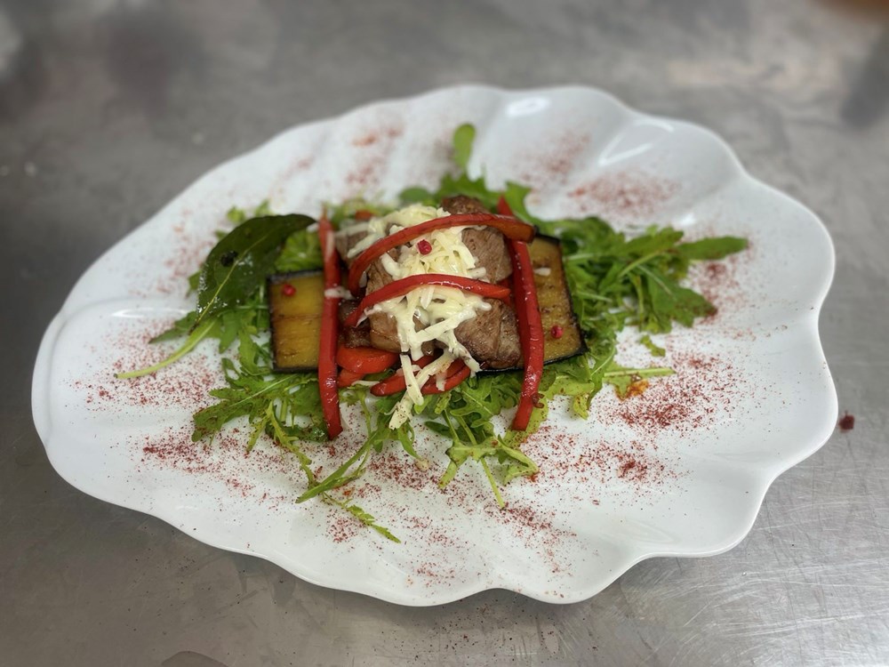 Na veliki bijeli tanjur možemo kao pozadinu doslovno "baciti" pola šake rukole. Na rukolu stavimo fetu patlidžana. Na fetu patlidžana posložimo papriku pa na nju stavimo trakice prženog ramsteka na koji stavimo cca 7 dkg krupno naribane sira gaude, preko koje stavimo nekoliko trakica pržene crvene paprike… Sve poprskamo s par kapi maslinova ulja i naš je pjat spreman… dobar Vam tek dragi ljudi!
