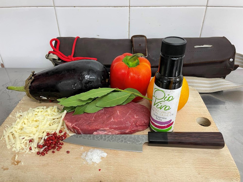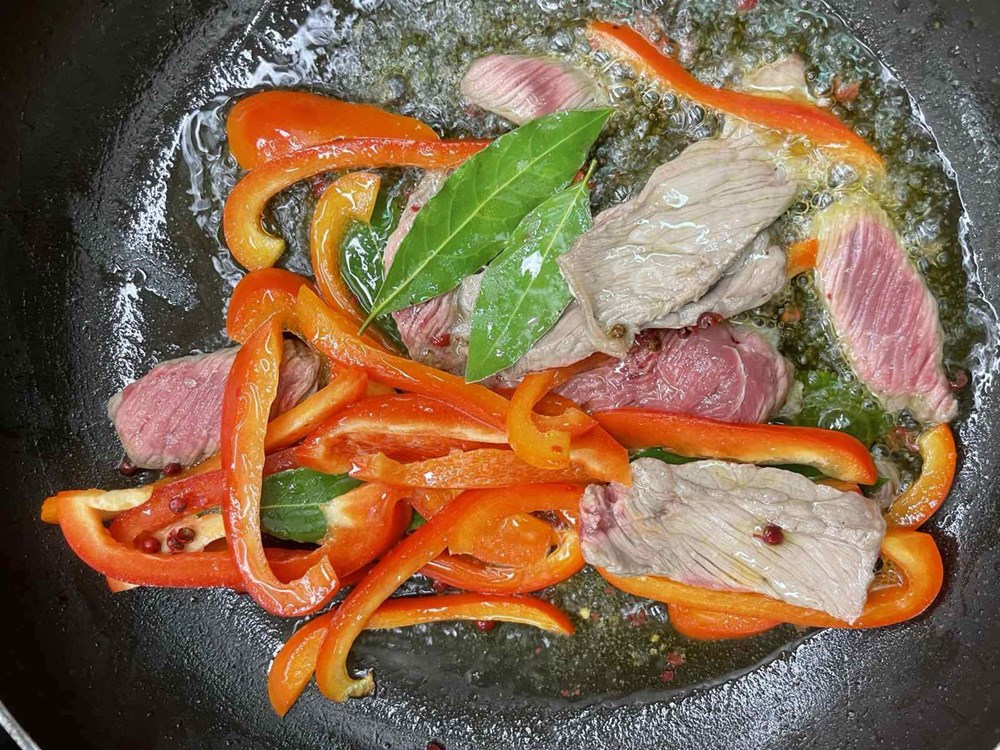 U drugoj tavi zatim na vrelom maslinovom ulju pržimo ramstek narezan na trakice, papriku narezanu na trakice, čajnu žlicu crvenog papra u zrnu, pet do sedam svježih listova lovora… Nakon cca 5 minuta naš je ramstek s paprikom spreman za slaganje te ga maknemo s izvora topline.