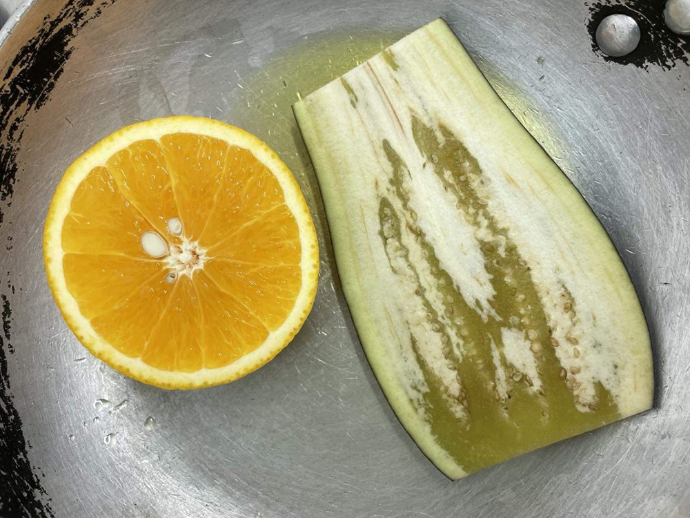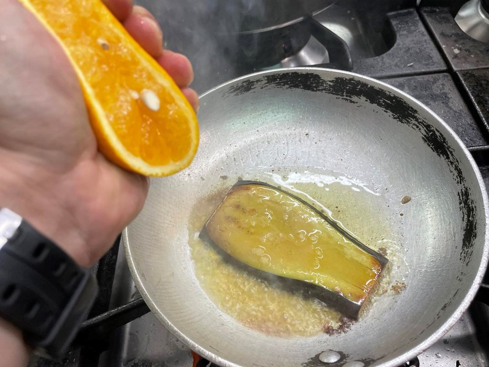 Patlidžan narežemo na fetu nešto tanju od našeg malog prsta na ruci pa ga stavimo peći na vrelo maslinovo ulje s malo cvijeta morske soli. Nakon cca 2,4 do 3 minute okrenemo patlidžan na drugu stranu, prelijemo ga dok se prži na maslinovom ulju sa sokom od pola naranče, pečemo ga još minut i pol, maksimalno dva s druge strane pa ga maknemo sa izvora topline.