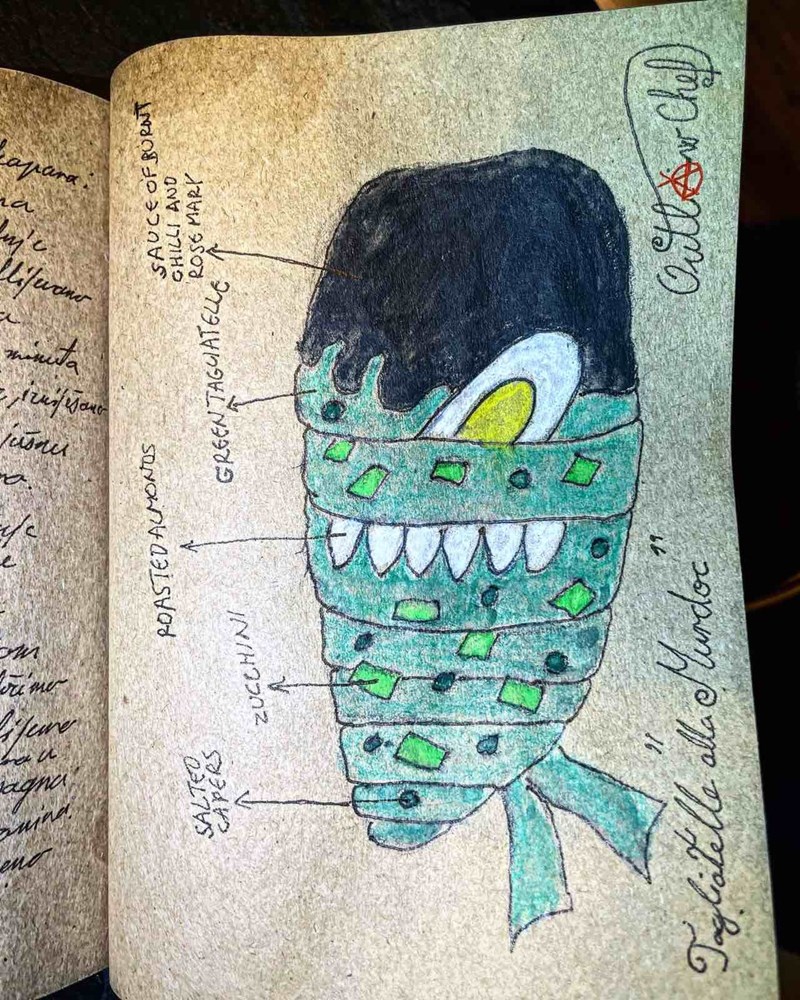 Budući da je svoj trojici od Gorillaza najsimpatičniji Murdoc, odlučujemo se da jelo bude njegov gastronomski portret. Ne samo po izgledu , već i po sadržaju. Zelene tagliatelle mogle bi biti njegovo lice, a med i izgorena chilli paprika njegova duša... Dakle... 3, 2, 1... Zakuhajmo! Yhhhaaaaaaaa!!!!!